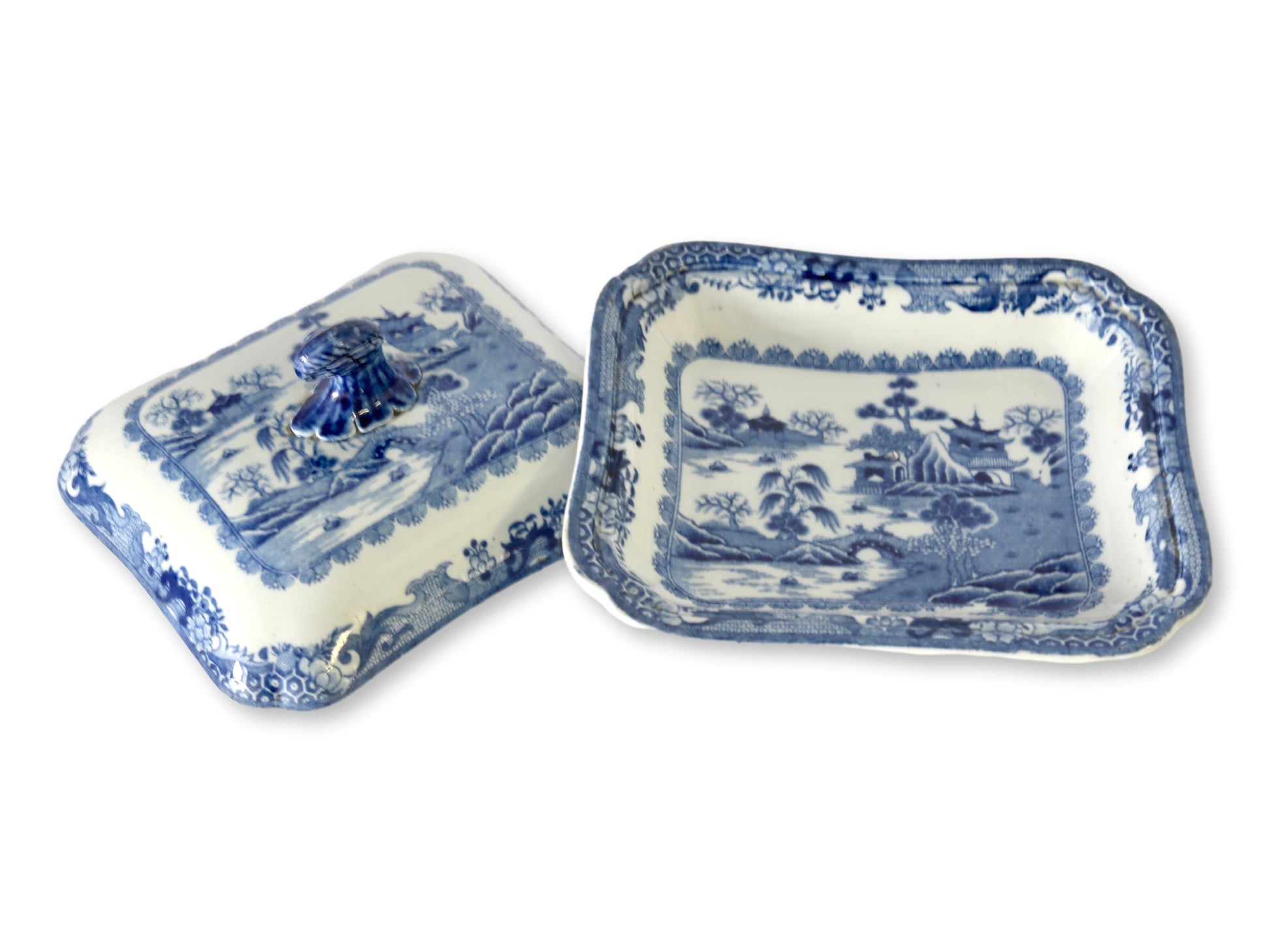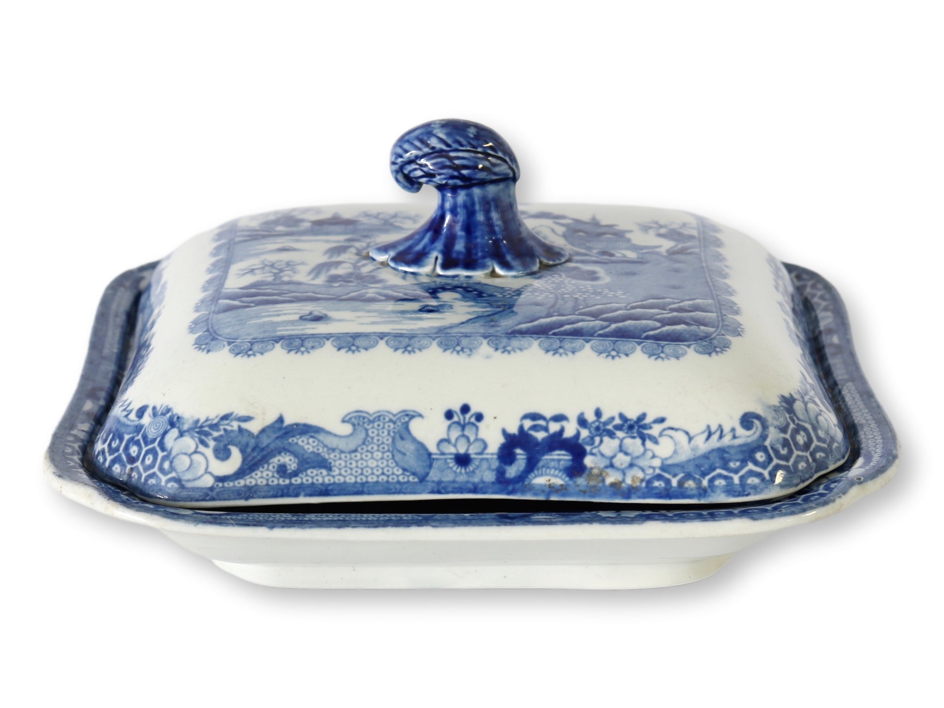 Antique English covered tureen in an early willow variant pattern. Made circa 1820 with the typical pearlware glaze used during that time period. No maker's mark.