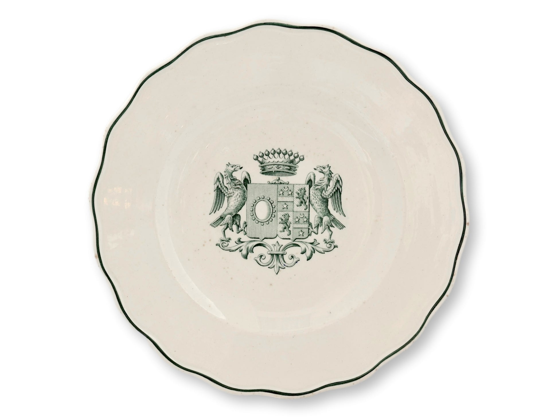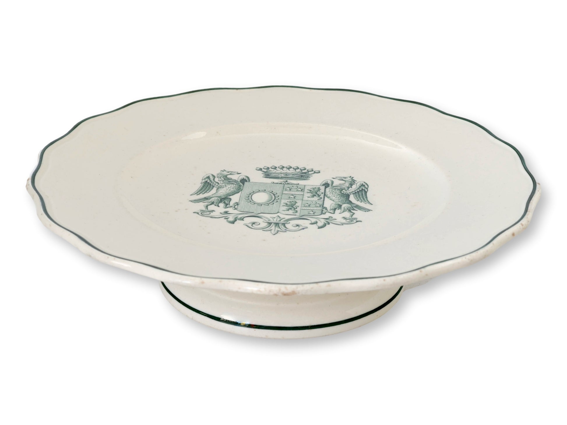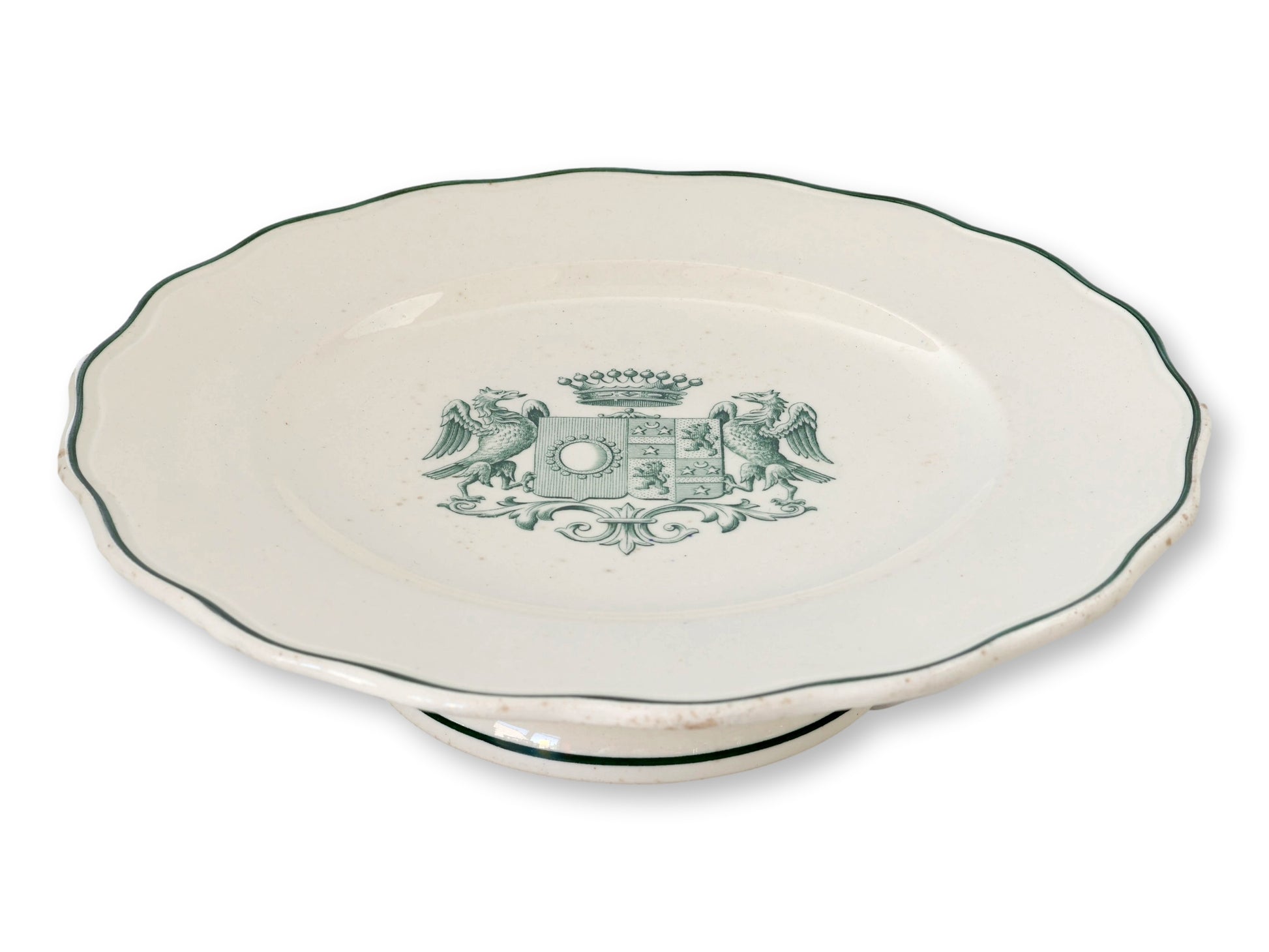 A stunning late 19th-century transferware cake plate featuring an intricate green crest with a regal crown, twin eagles, and a central shield adorned with heraldic detailing. The scalloped edge and hand-applied green trim add an elegant touch to this historical gem. Perfect for collectors of fine ceramics or anyone looking to bring a sense of heritage to their table or display. Stamped on bottom.
