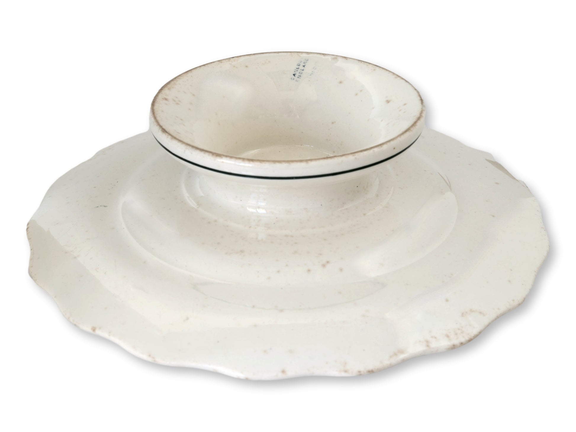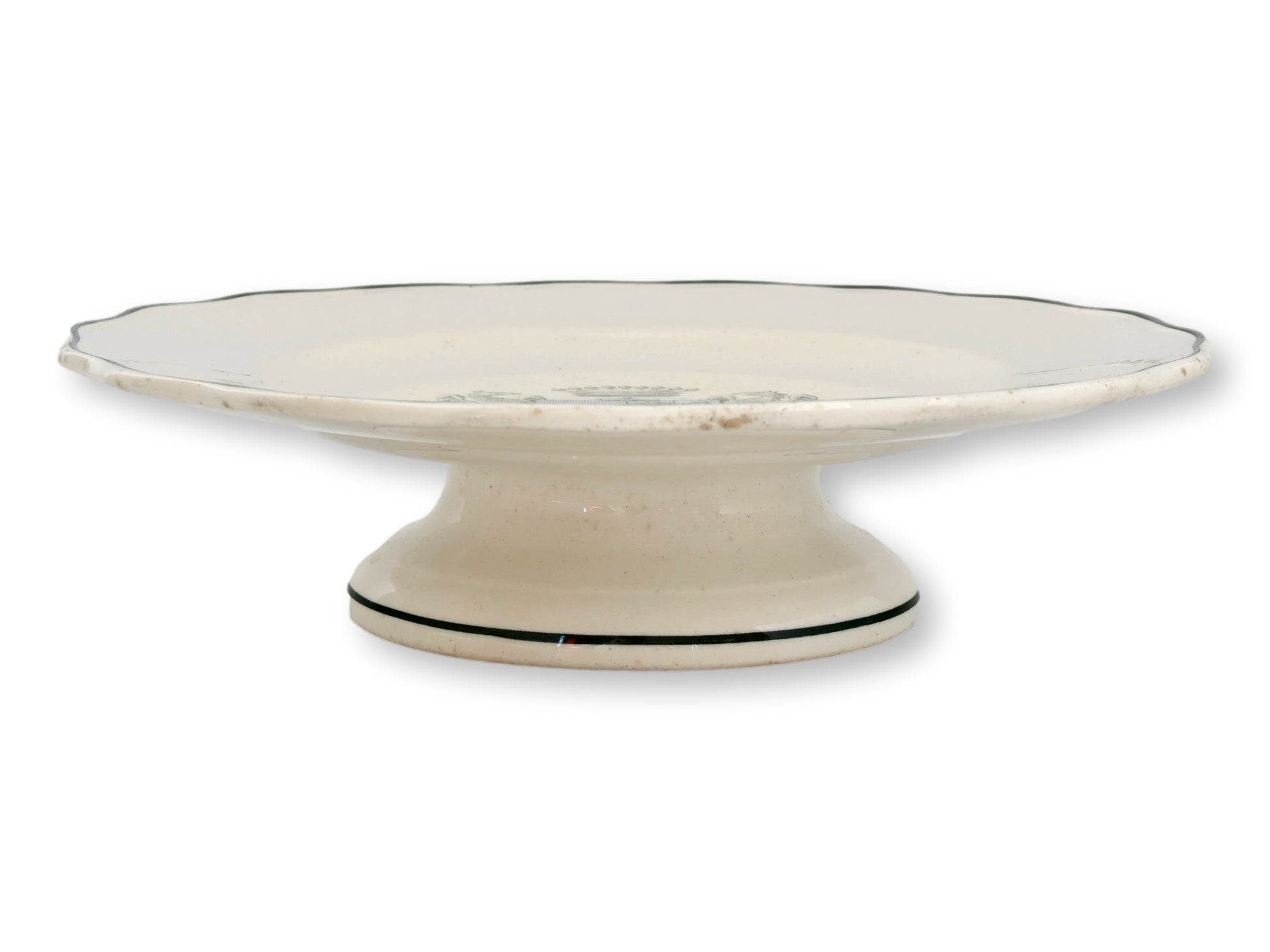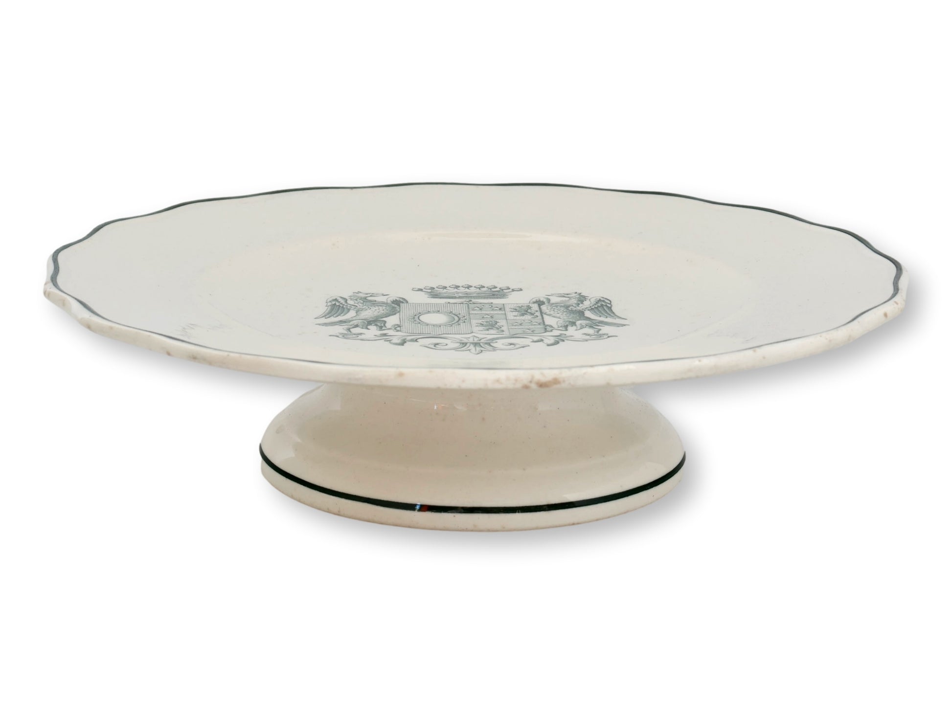 A stunning late 19th-century transferware cake plate featuring an intricate green crest with a regal crown, twin eagles, and a central shield adorned with heraldic detailing. The scalloped edge and hand-applied green trim add an elegant touch to this historical gem. Perfect for collectors of fine ceramics or anyone looking to bring a sense of heritage to their table or display. Stamped on bottom.