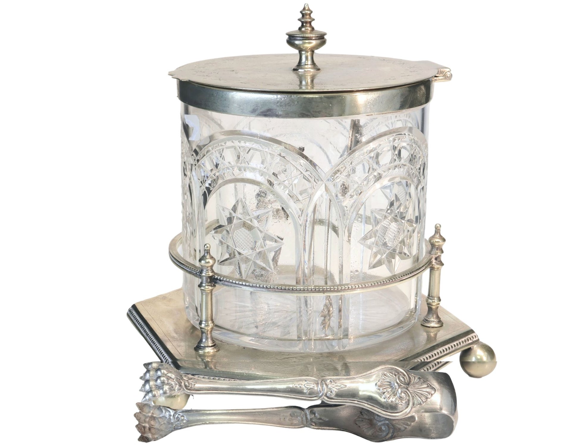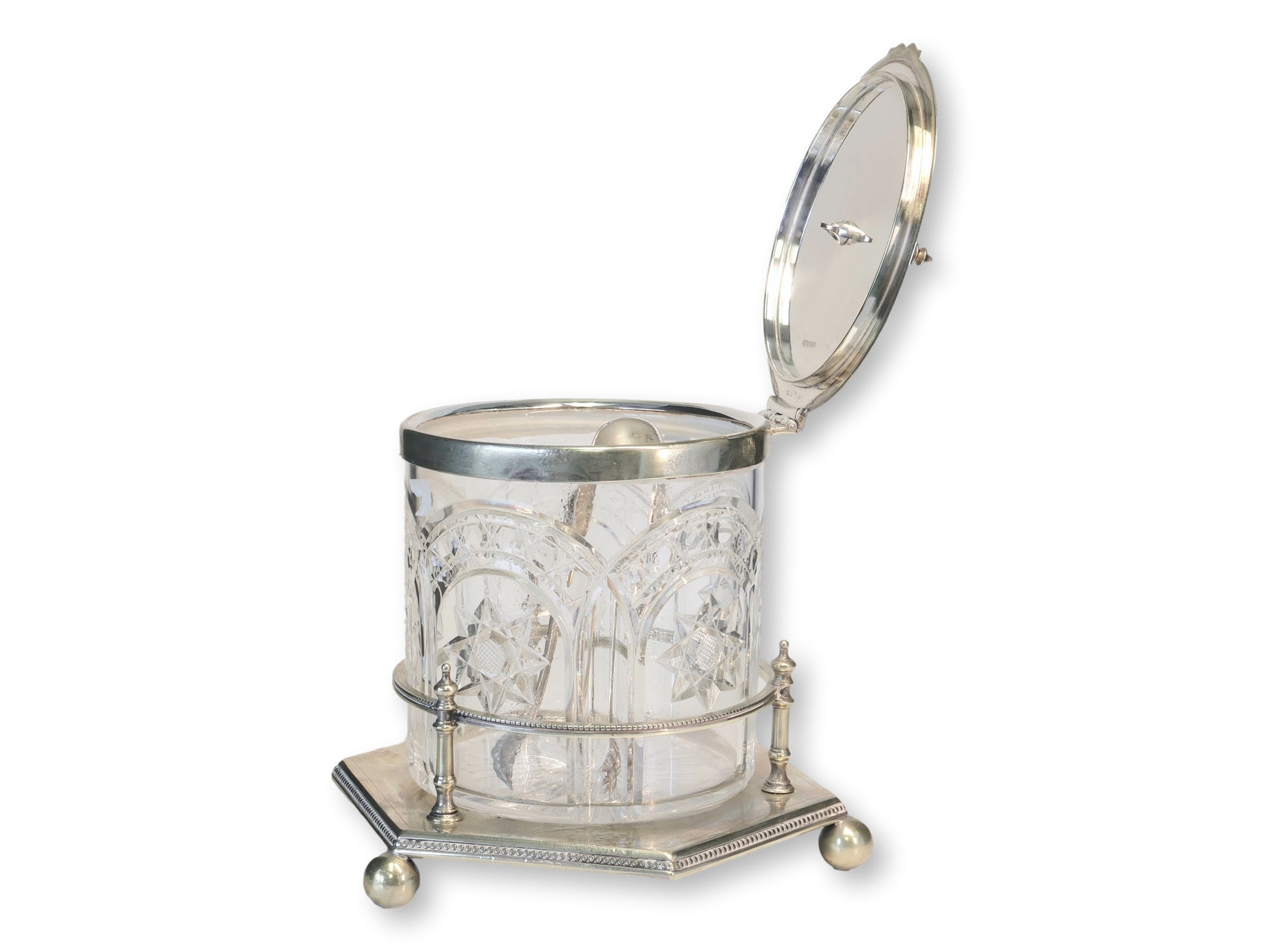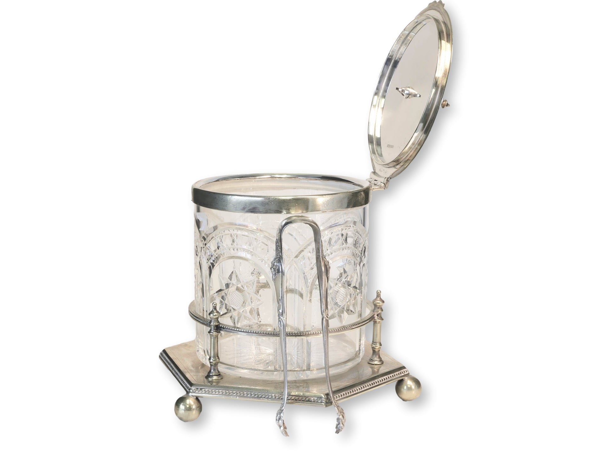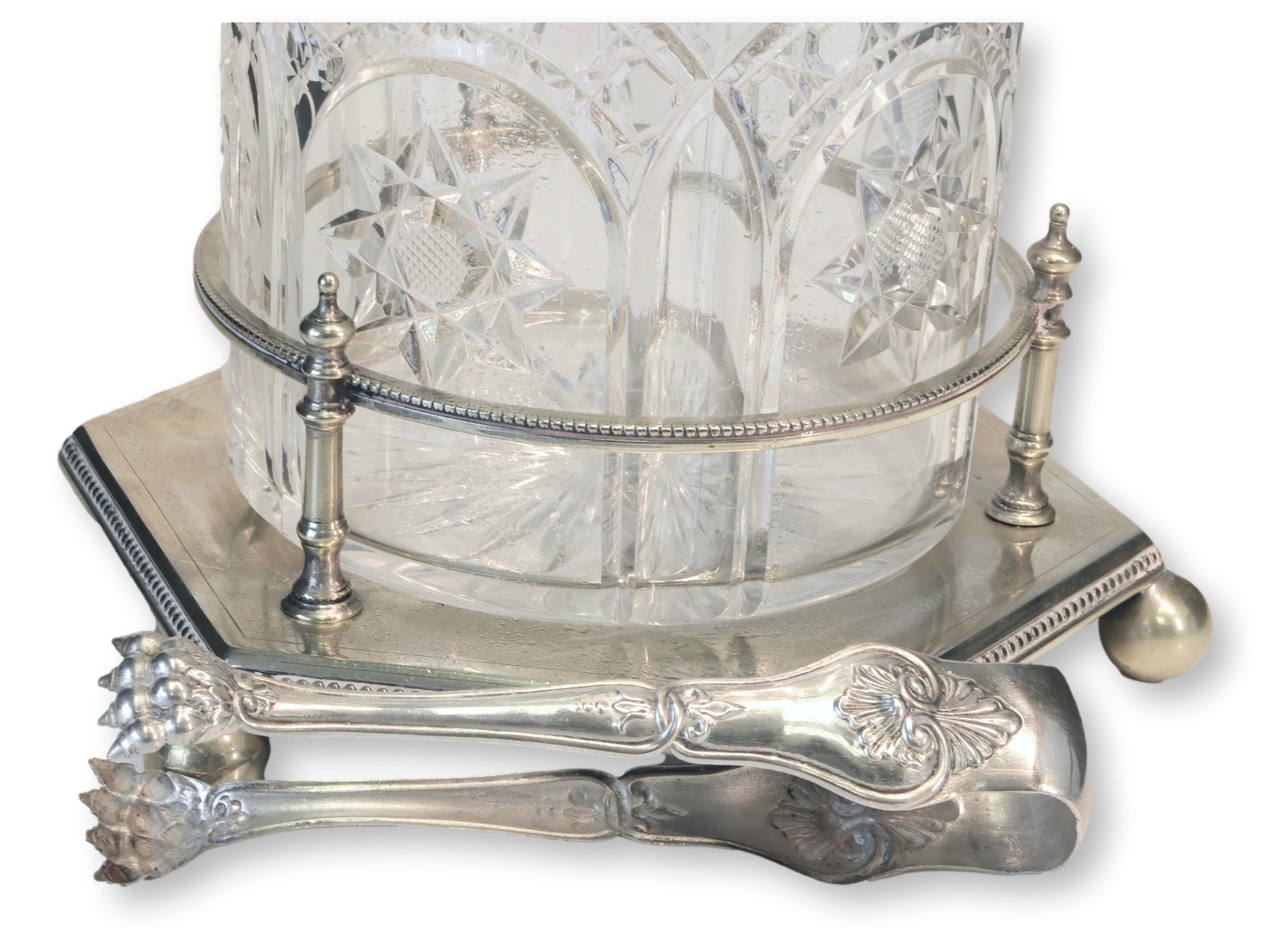 Elevate your barware game with this dazzling 1920s English crystal ice bucket, housed in a silver-plated stand and paired with a coordinating set of silver tongs. The hand-cut crystal features a striking Gothic arch and starburst motif, beautifully refracting light and adding drama to any cocktail hour.