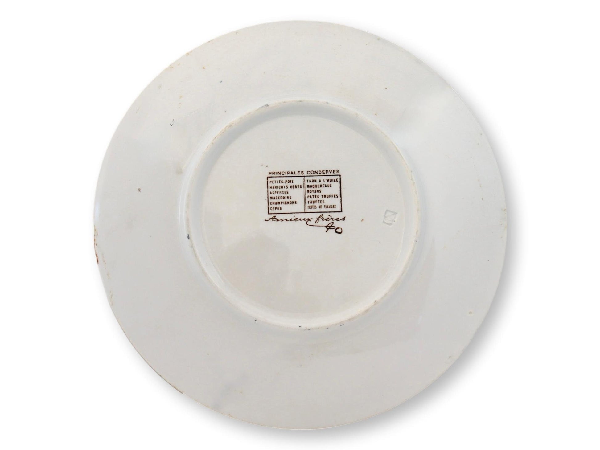 Step into the golden age of French advertising with this striking Majolica bistro plate, a tribute to the famed Amieux Frères sardine brand. Featuring a vibrant Breton seaside scene, it captures the essence of Brittany’s fishing heritage. Four lifelike trompe l’oeil barbotine sardines add depth and texture, a hallmark of Majolica craftsmanship. The inscription around the rim, "Les vraies sardines Amieux Frères portent la devise, Toujours mieux" (Real Amieux Brothers sardines carry the motto, Always better), pays homage to one of France’s most renowned seafood producers. A remarkable blend of artistry and marketing, this antique plate is a true collector’s piece. Signed.