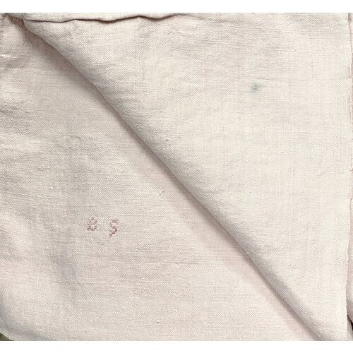 Made circa 1920, this collection possesses an air of sophisticated elegance, devoid of the typical monograms but instead featuring the initials of the seamstress. This touch was common in fine French linens of the period (see photo) and adds an authentic charm to the set. Washed in soothing lavender water and heavily starched, the linens provide a rich texture and aromatic presence that evoke the countryside of France. Minor color irregularities and light spots from ironing with heavy starch are normal characteristics of this artisanal process and will wash out, adding to the vintage charm of this remarkable set.
