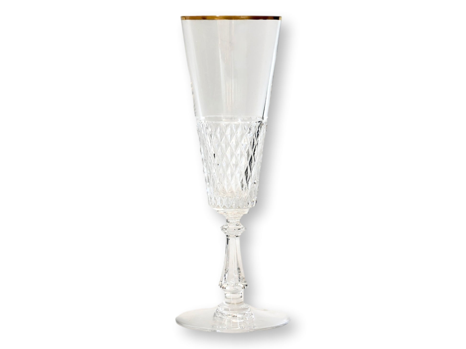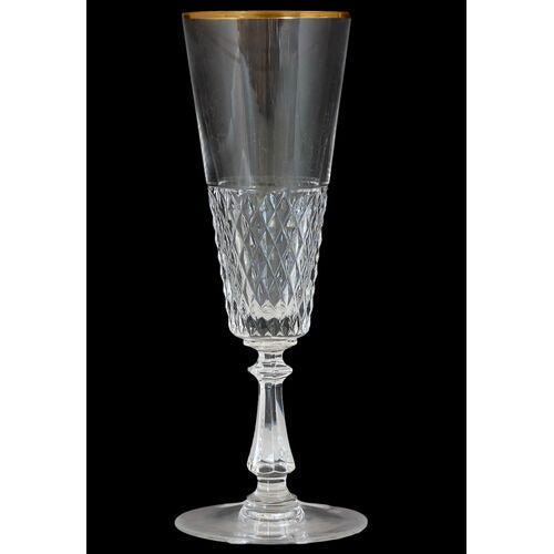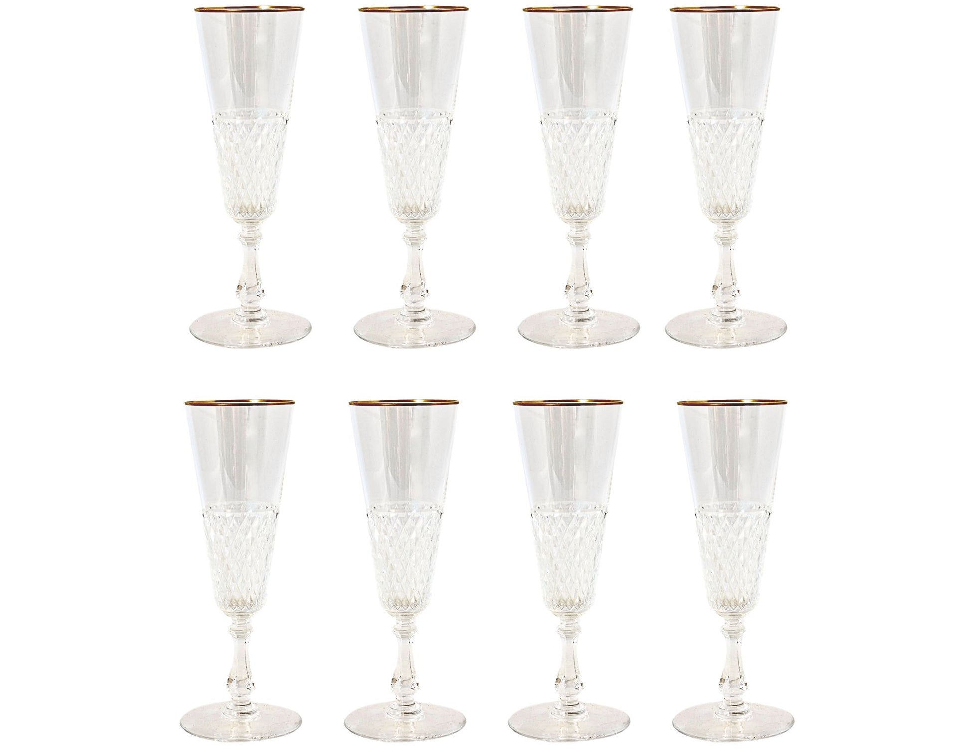 Set of eight exquisite 1920s French crystal champagne flutes. Purchased in Paris, each flute features a refined diamond-cut pattern and a delicate gold rim, embodying the elegance of the Art Deco era. Perfect for toasting special occasions or as a luxurious addition to your glassware collection. A timeless piece of French craftsmanship. Unmarked.