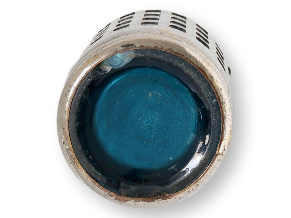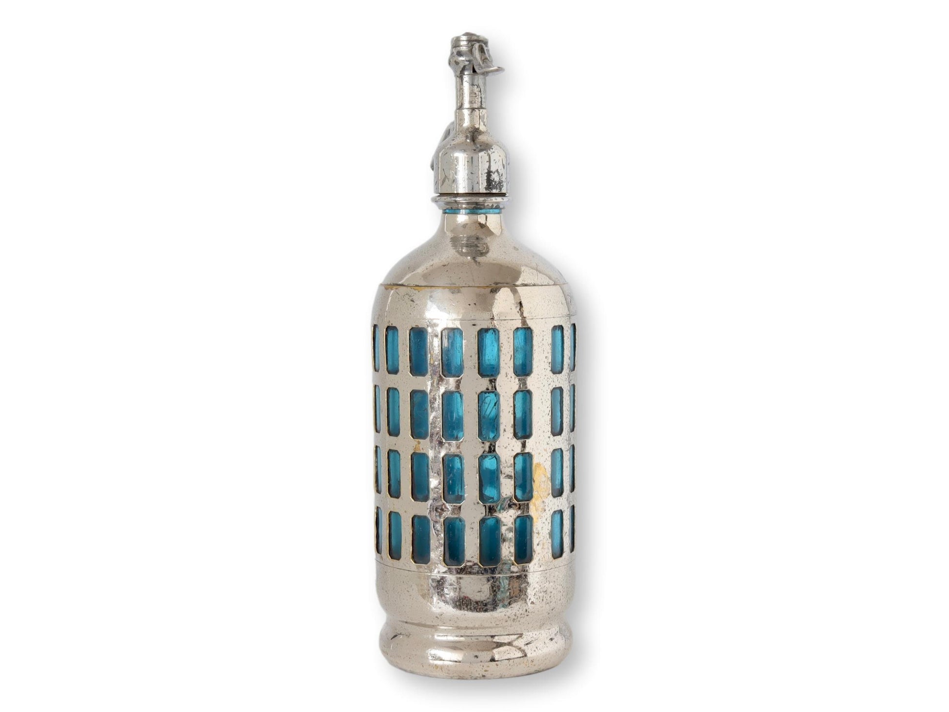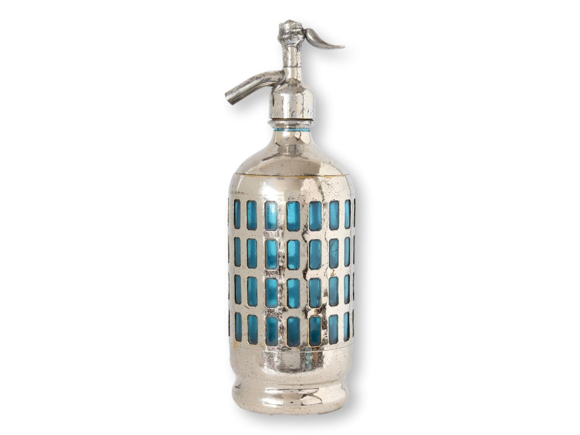 This 1930s French seltzer bottle, encased in an elegant silver-plate cage, is a beautiful representation of functional design from a bygone era. Perfect for adding a vintage touch to your home bar or as a unique decorative piece. Please note, the disassembled photo is for reference and does not represent this specific bottle. Fully marked with Paris insignias.