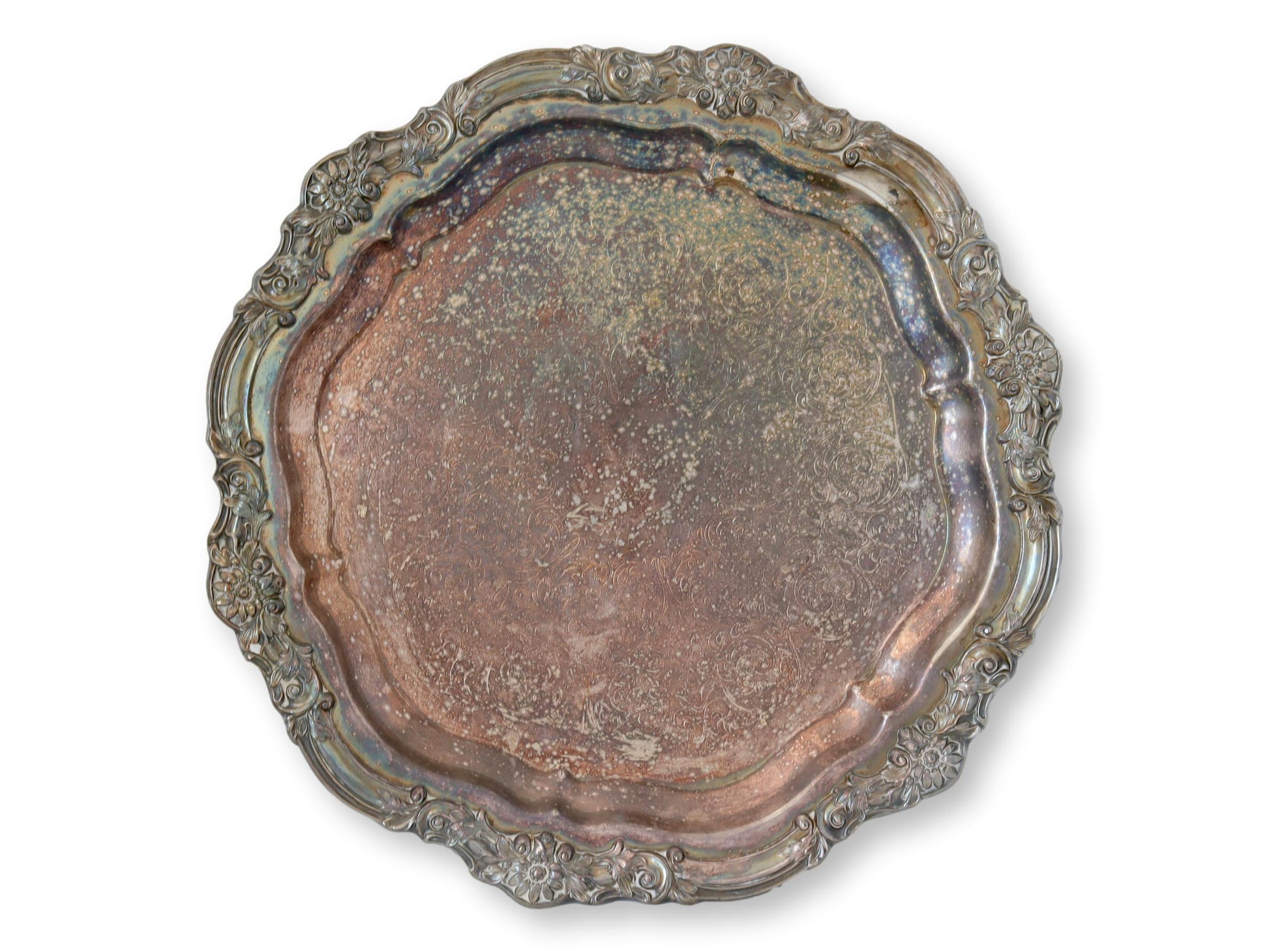 This distinctive silver-plated tray is a testament to the beauty of age, showcasing a one-of-a-kind oxidized color that highlights its intricate, ornate border. The rich patina tells a story, making it a striking and unique addition to any collection or display.