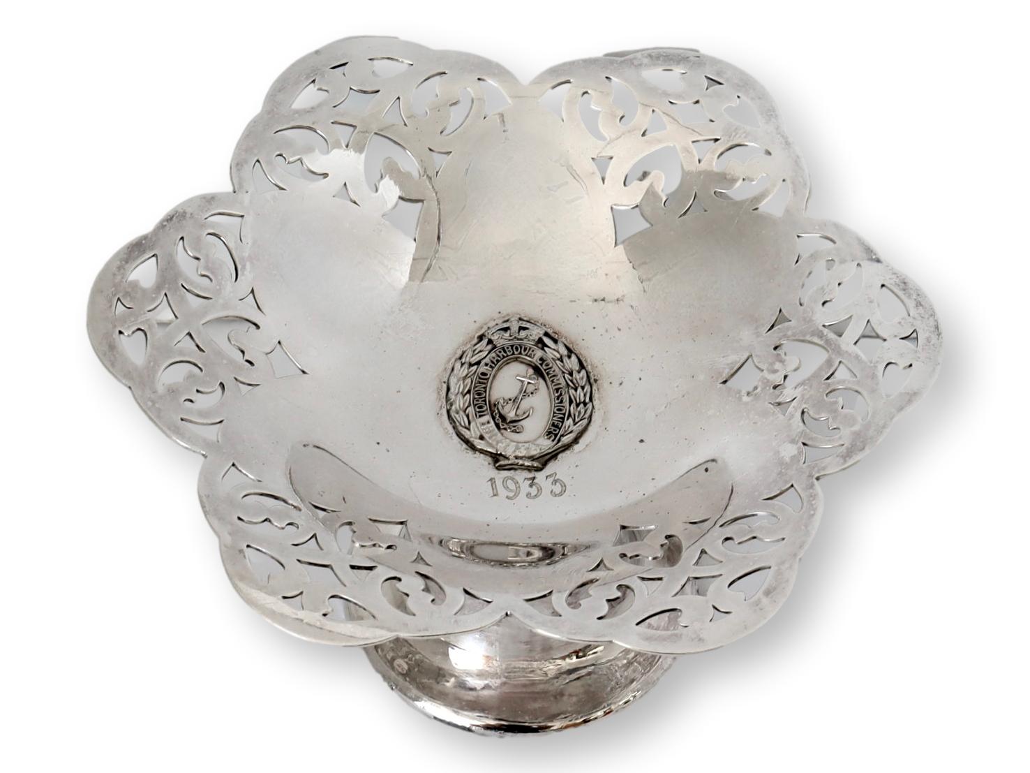 This stunning 1933 Toronto Harbor Commissioners Trophy is a fine example of English silver-plate craftsmanship. The intricately designed bowl features a delicate, openwork pattern and proudly displays the Toronto Harbor Commissioners emblem and the year 1933. This trophy stands as a testament to maritime heritage and the elegance of early 20th-century award pieces. Ideal for collectors of nautical or silver-plate memorabilia, this trophy adds historical significance and refined beauty to any collection.