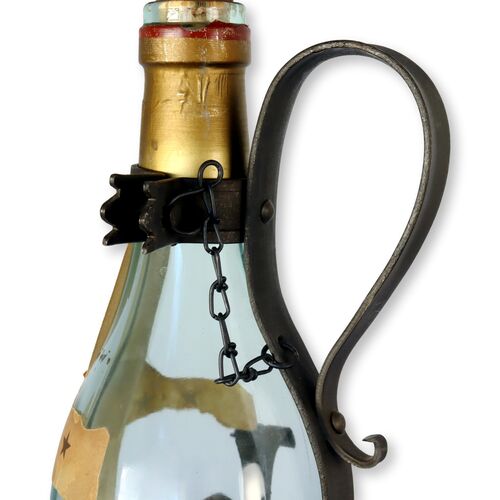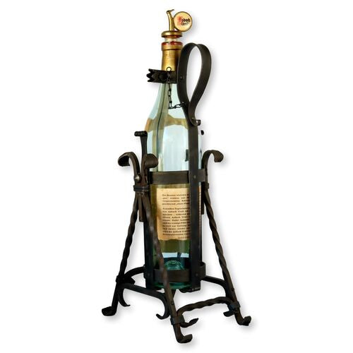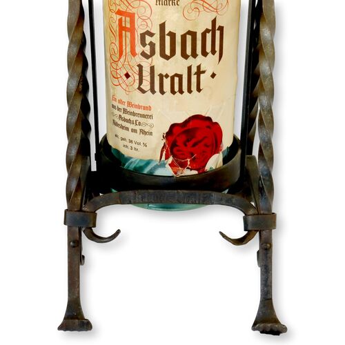 Elevate your bar's elegance with this Midcentury hand-forged wrought iron liquor cradle, crafted for the iconic Asbach Uralt German Brandy. This piece fits 4L bottles perfectly and features a convenient swinging mechanism for easy pouring. Authentic manufacturer markings adorn both the cradle and the bottle, adding a touch of vintage sophistication to your collection. It's not only functional but a striking decorative piece that celebrates the rich heritage of Asbach GmbH.