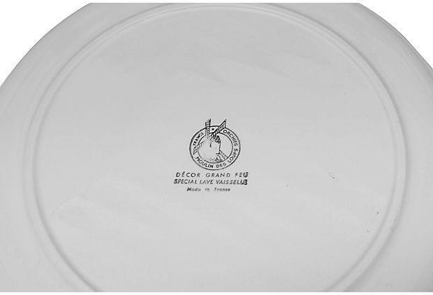 This 14-piece French asparagus serving set from the 1960s is a vibrant collection that captures the essence of mid-century tableware design. Rendered in a striking green hue, the set includes plates and a serving platter, each featuring a textured surface that beautifully mimics the ridged contours of asparagus stalks. Signed on bottom. Light wear.
