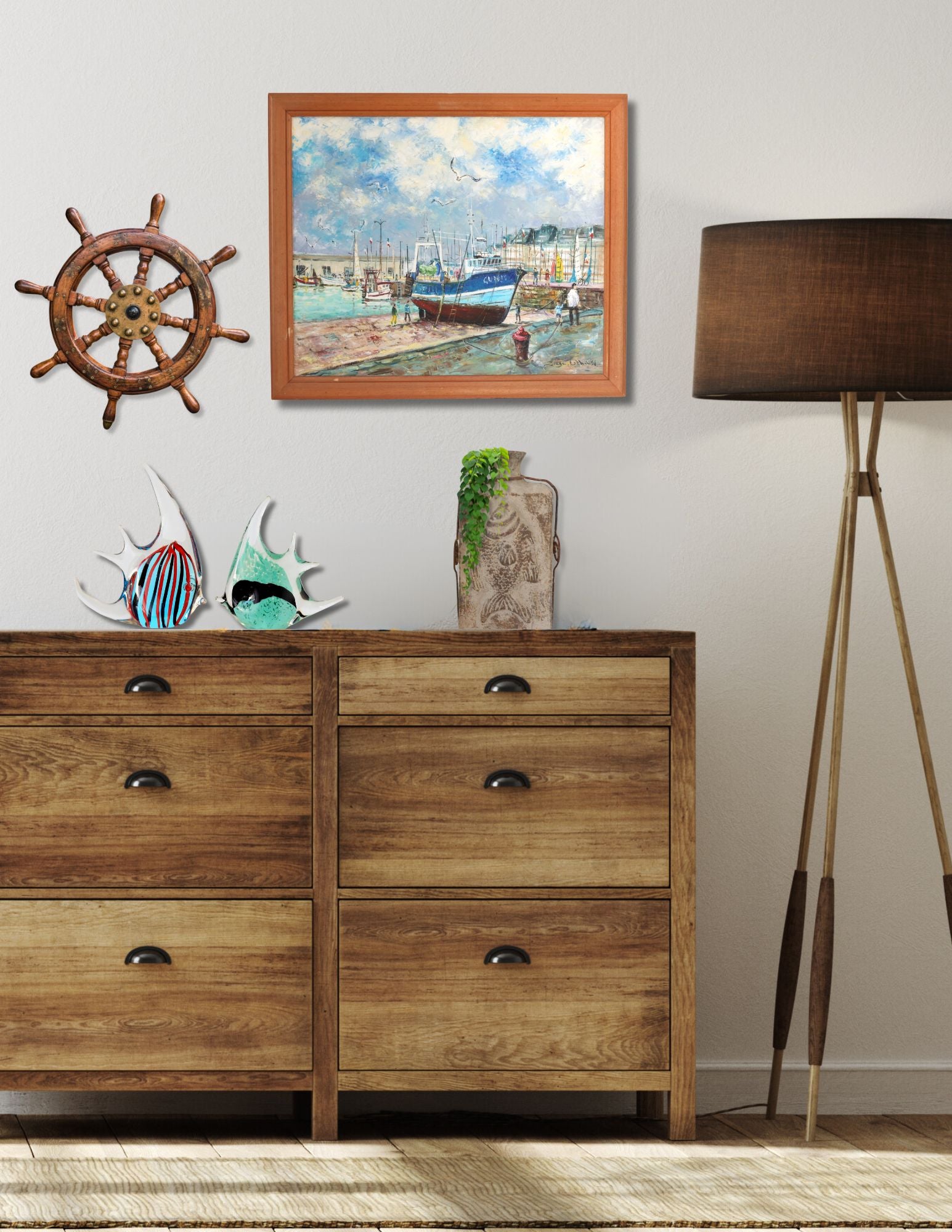 Painted in bold, textured strokes, it conveys both the bustle of a working port and the charm of a historic seaside town.