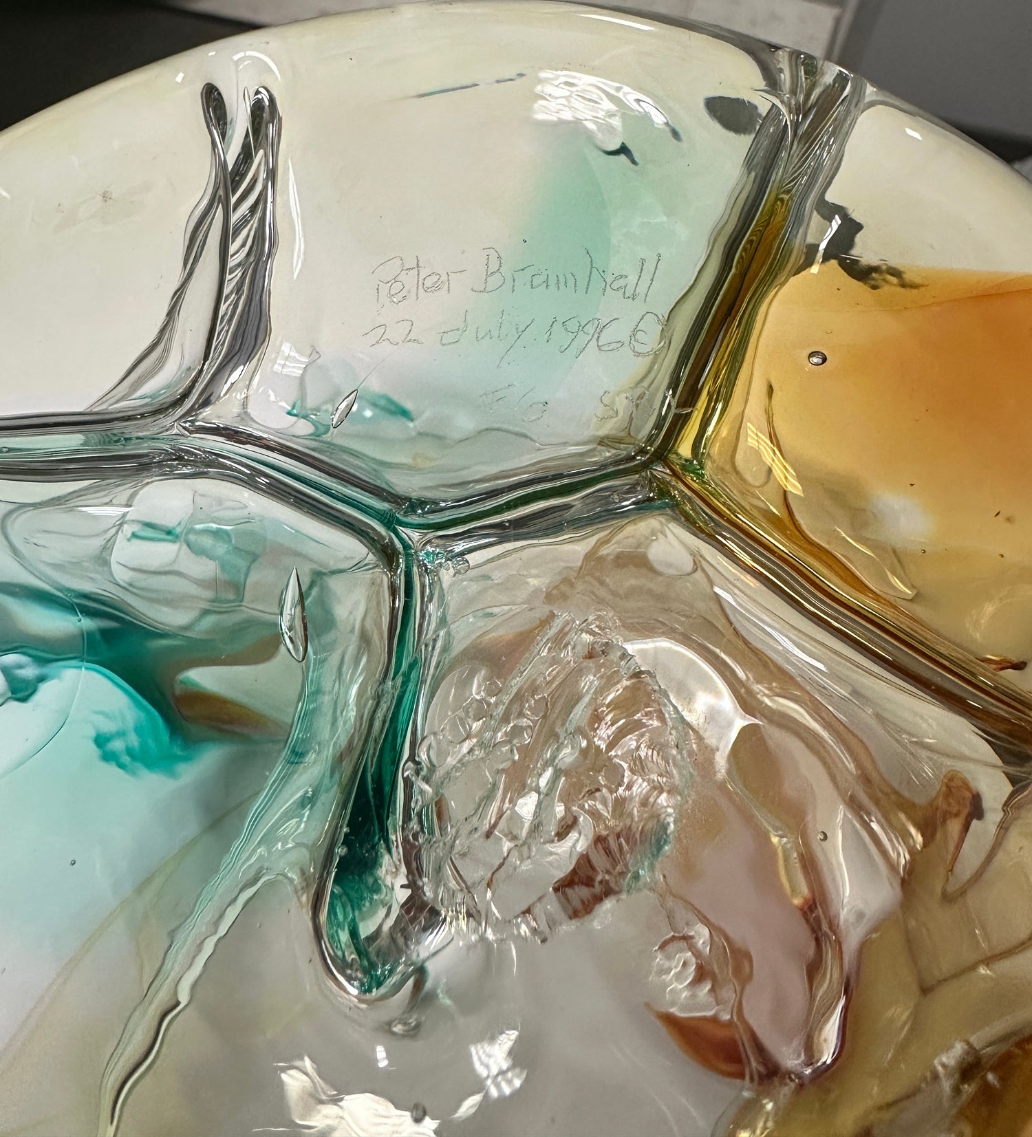 Signed studio glass orb by Vermont-based glass artist Peter Bramhall, dated 22 July 1996. Known for his organic, free-blown forms, Bramhall—who now creates under the name Paedra Bramhall—has long been celebrated for his experimental approach to glass. This sculptural piece features flowing hues of amber, green, and celadon suspended in clear glass, capturing light and motion in a striking, one-of-a-kind form. A brilliant work of art that showcases Bramhall’s mastery of form and fluidity. Signed