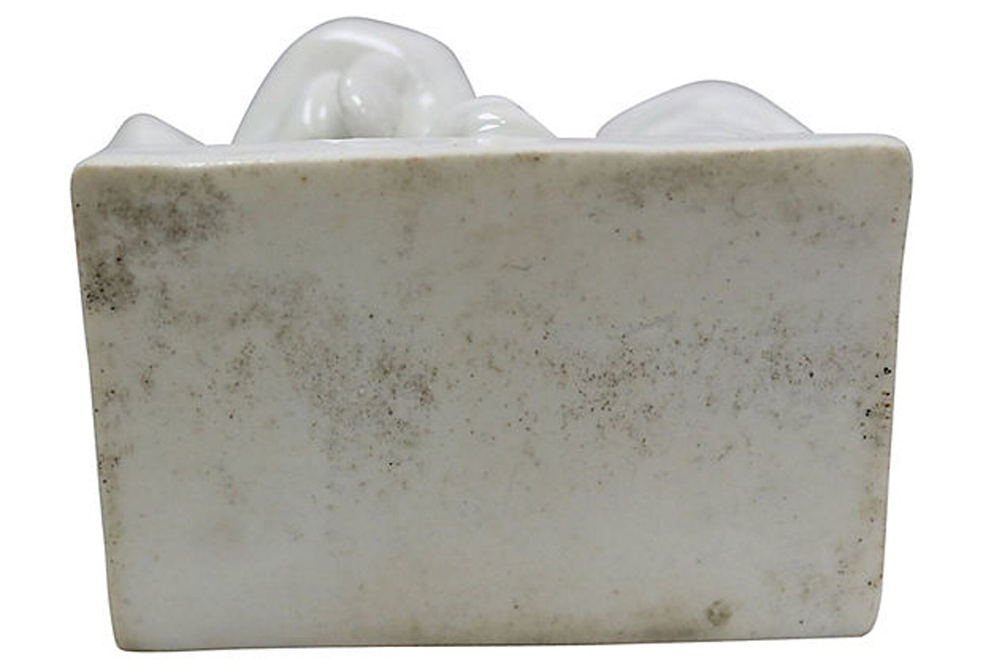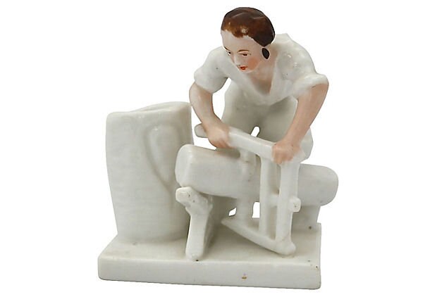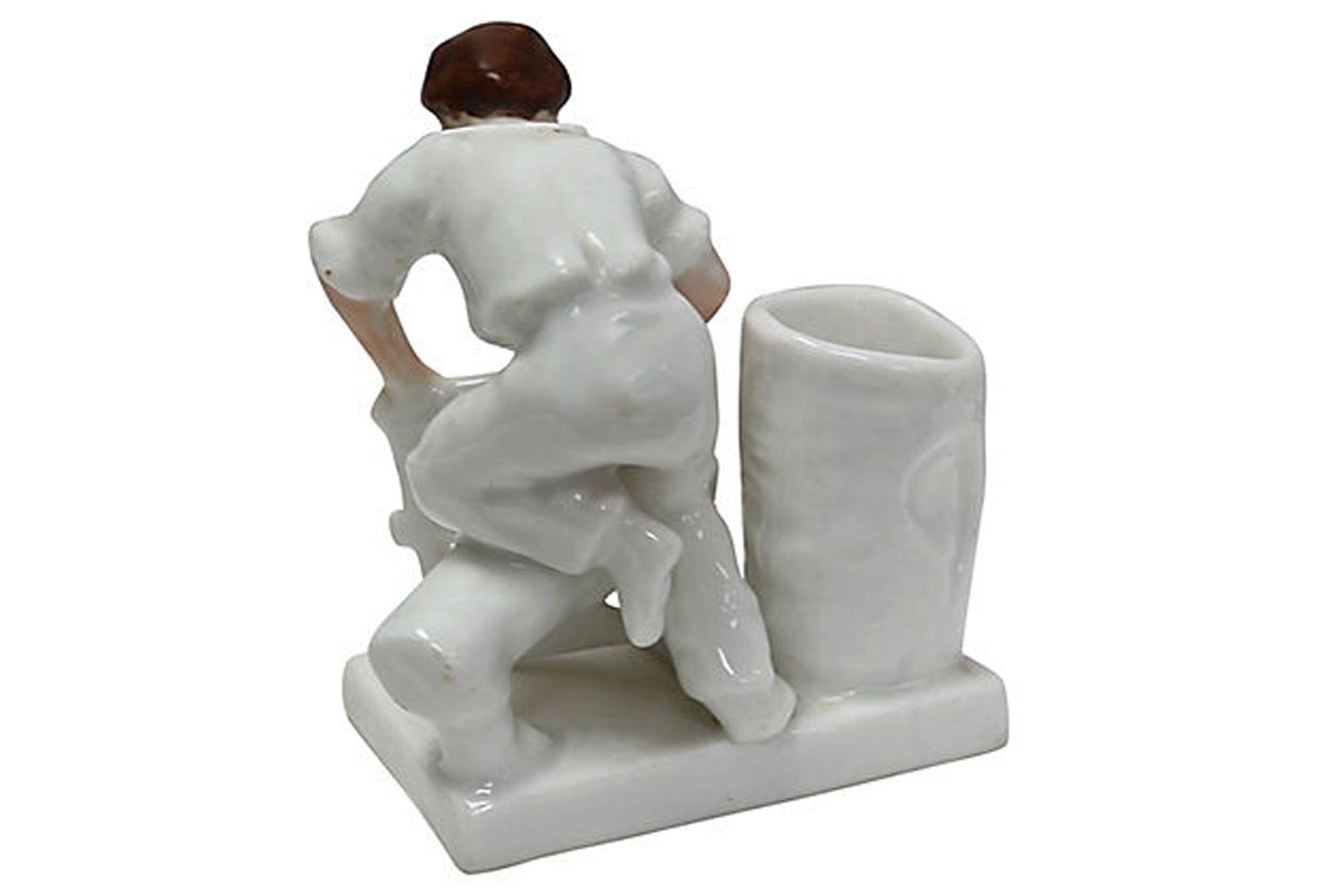 Antique English porcelain figural match holder with striker on underside. Figural, depicting a wood craftsman sawing a log. No maker's mark. Light wear. Made circa 1880.