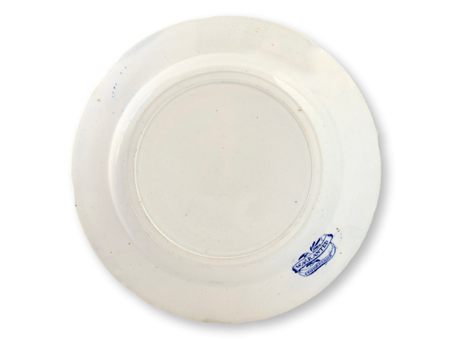 Set of ten mid-19th-century English blue and white Willow pattern 8.75" plates, each with scalloped rims and rich cobalt transfer decoration. Made of earthenware and marked “Warranted Staffordshire,” a stamp used by several leading potteries of the period, including Adams, Clews, and Riley.