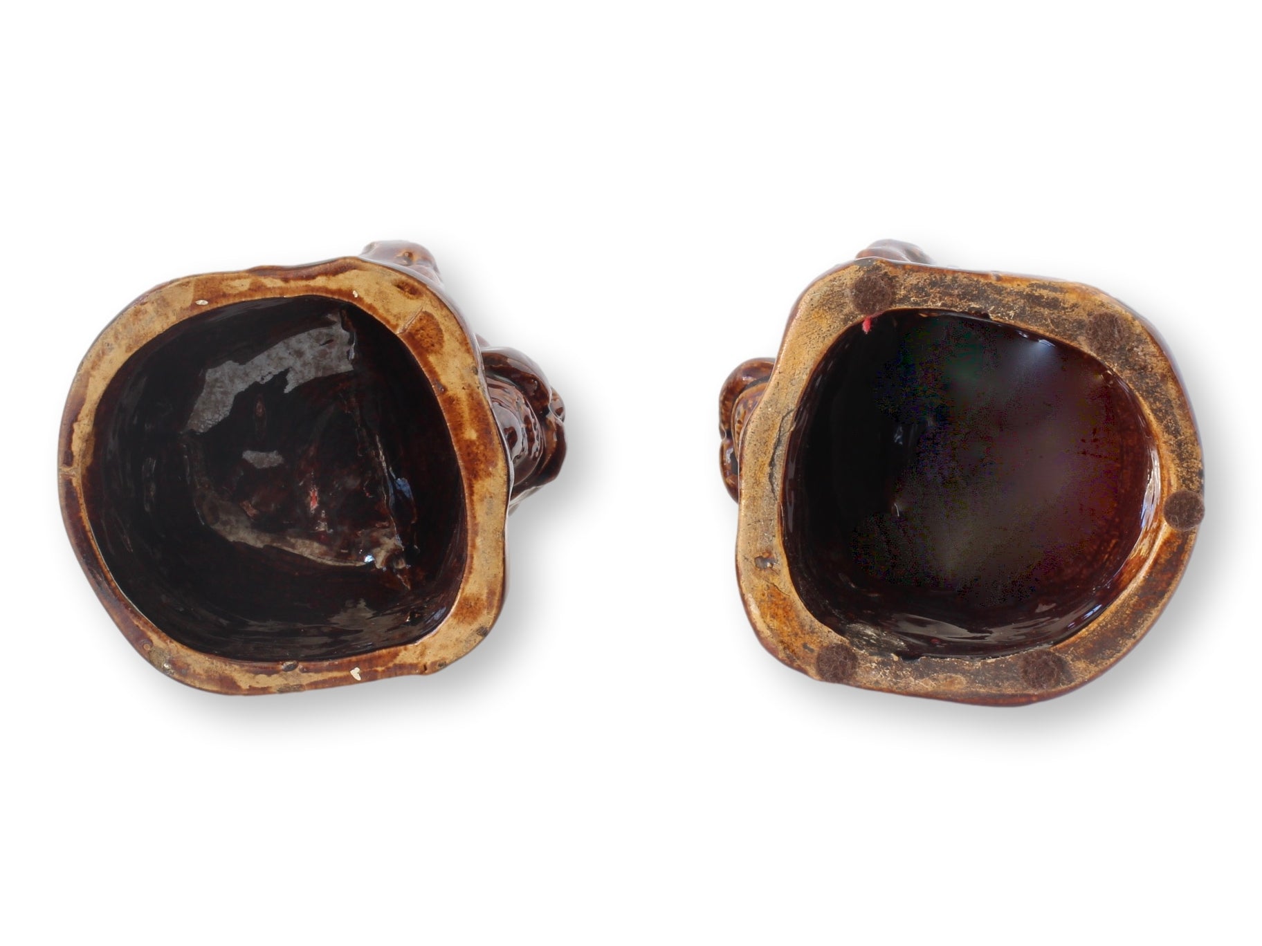 This pair of Victorian-era window sash stops features bold lion's head designs finished in a rich Rockingham glaze. Dating to around 1850, these functional yet decorative pieces were designed to keep sash windows securely open for ventilation. The striking lion's heads add a touch of grandeur and historical charm, making them both practical and collectible. Perfect for those who appreciate unique architectural antiques. No maker's marks.