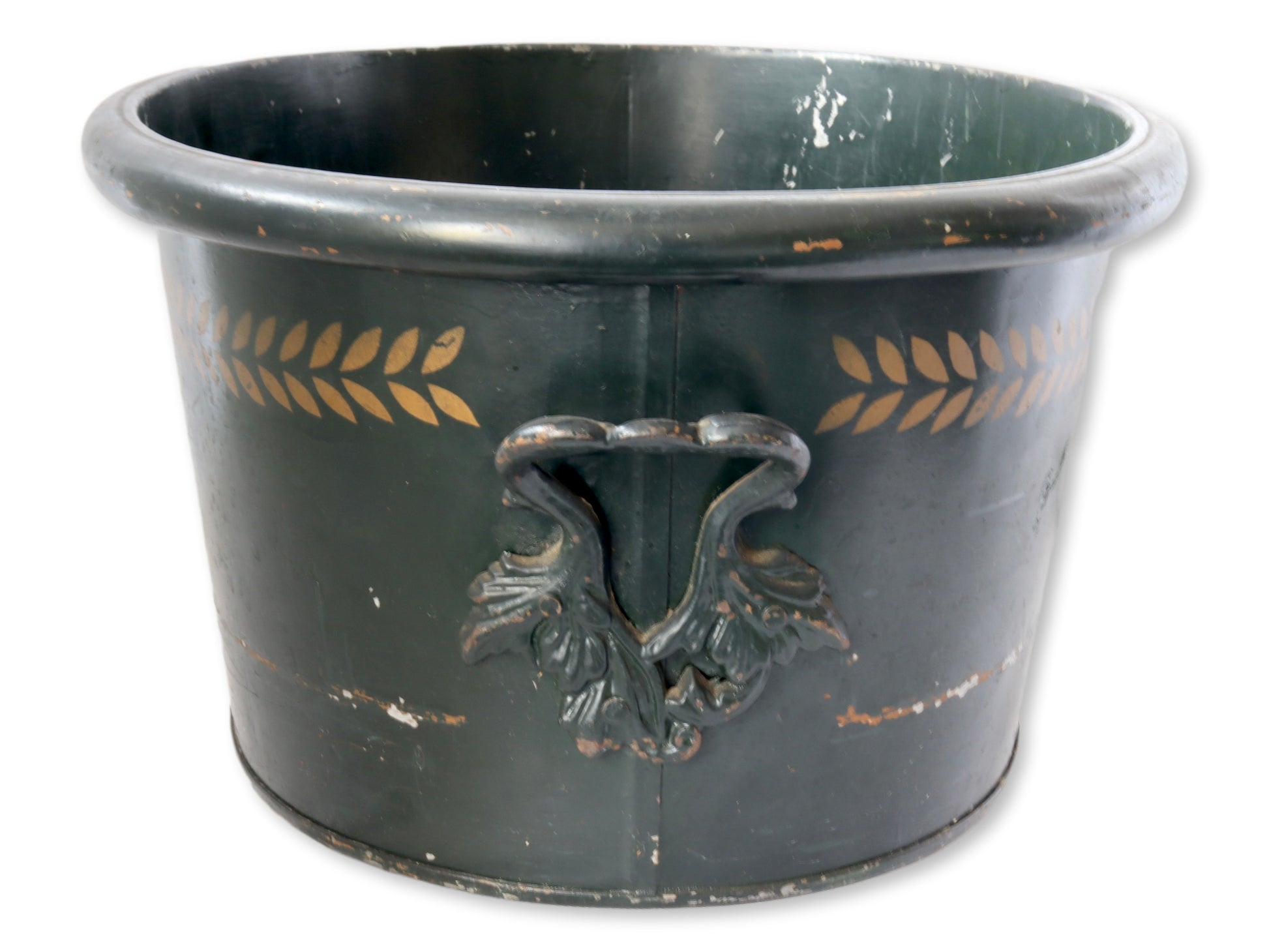 exquisite antique toleware tub/basin, purchased in Coastal Maine. Painted in a deep green hue and adorned with elegant gold accents, this piece exudes timeless charm and sophistication. Ideal as a beverage cooler, it brings a touch of vintage elegance to any gathering. The sturdy construction ensures durability, making it a functional yet decorative addition to your home. Perfect for those who appreciate unique, one-of-a-kind items with a rich history. No maker's marks.