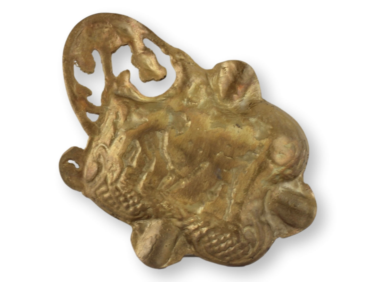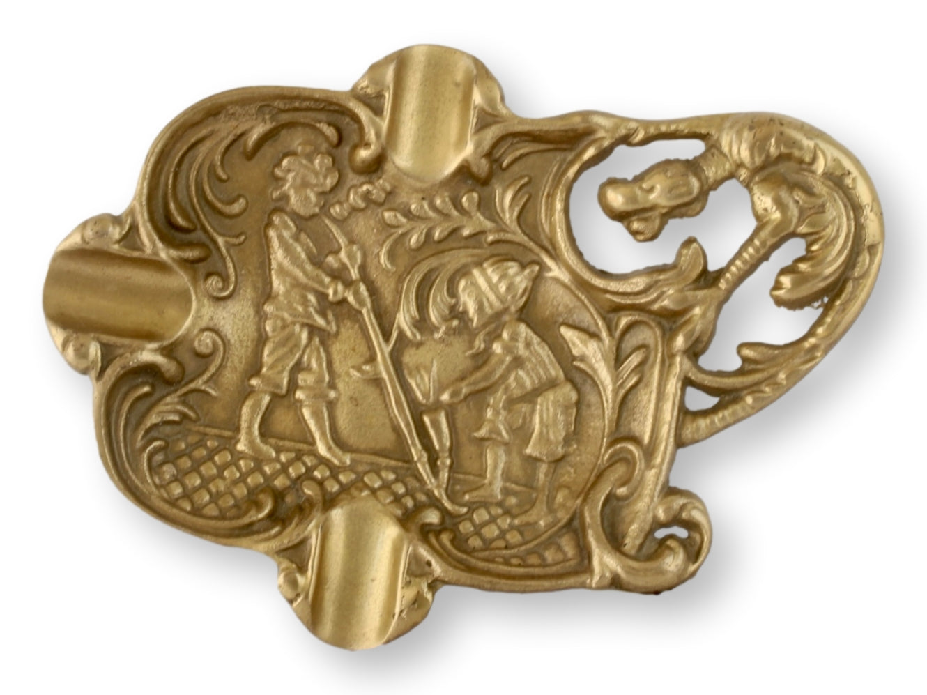 Unique antique brass ashtray featuring a detailed scene of two Dutch boys in traditional attire, surrounded by ornate scrollwork and a mythical creature, possibly a griffon or dragon. The intricate design and warm brass patina make this piece a captivating collectible, perfect for display or as a decorative trinket dish. An eye-catching addition for enthusiasts of vintage European decor or mythological motifs.