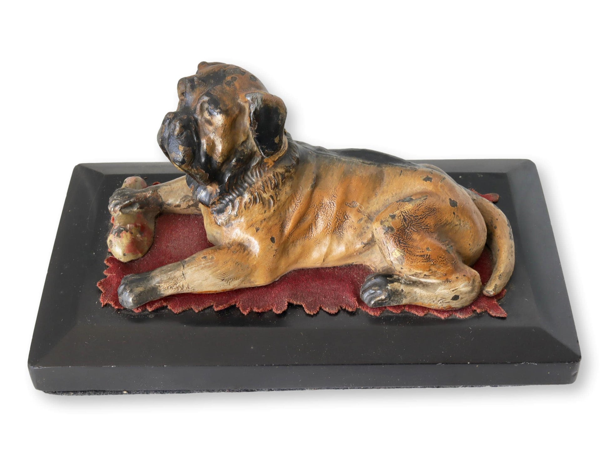 Antique bronze bulldog lying snugly on his favorite rug, while he guards what seems to be his treasured bone, captured with lifelike detail. Set atop elegant marble, this sculpture boasts a beautiful age patina that narrates tales of epochs gone by. Unsigned.