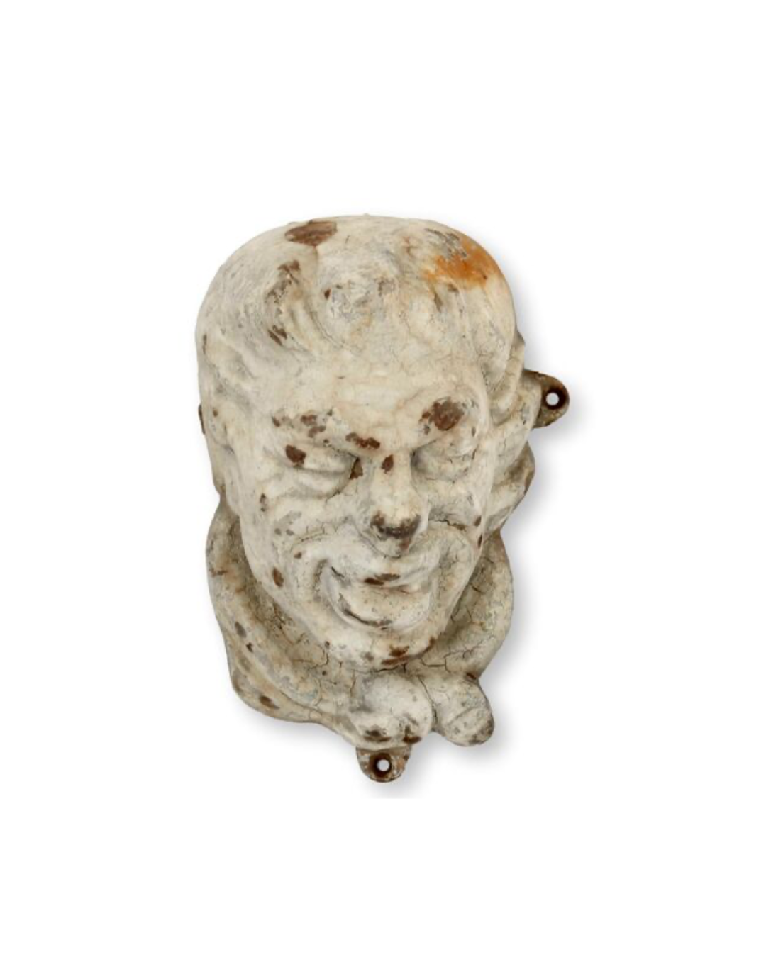 A dramatic antique cast iron mask, salvaged from a London estate garden and full of character—literally. Likely a nod to classic theatre, this heavy 14 lb piece has a haunting grin and pre-cast holes for mounting indoors or out. Perfect for adding a touch of Gothic flair to your gallery wall, courtyard, or secret speakeasy. Oxidation throughout adds authentic patina. No maker’s mark.