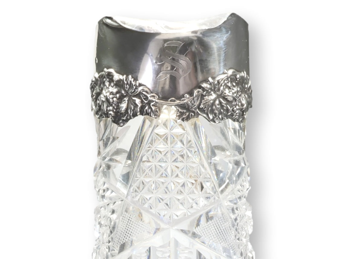 A showstopper worthy of a Gilded Age dinner party or a Jazz-Age supper club. This American Brilliant-Cut crystal claret jug, circa early 1900s, would have been the envy of high society when crystal and sterling reigned supreme on glittering tables. The heavy crystal body is deeply cut with dazzling flutes and starbursts, topped by a substantial .925 sterling silver collar richly chased with fruiting grapevine — the hallmark motif of Mauser Manufacturing Co., New York. Collar stamped “STERLING .925 FINE” with style number “753” and Mauser’s grape-vine logo. The front bears an elegant engraved monogram “S,” adding provenance and charm. A striking example of Mauser’s craftsmanship, blending brilliant cut crystal with ornate sterling detail — perfect for display or service, and still dripping with early-1900s glamour.