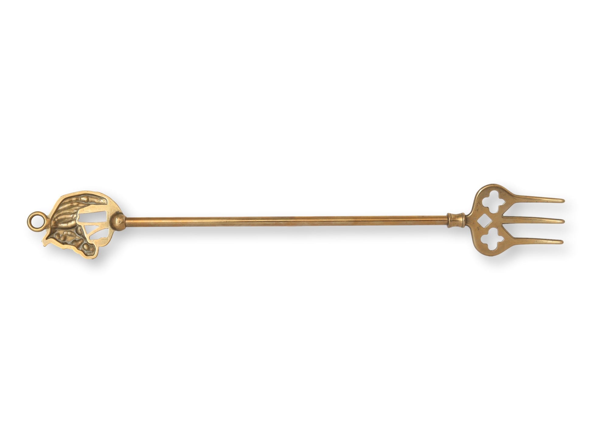 This Antique English Brass Toast Fork features a charming equestrian motif, with a finely detailed horse's head at the handle. The three-pronged fork is adorned with elegant cutout clover designs, adding to its decorative appeal. Crafted from solid brass with a warm patina, this piece was traditionally used for toasting bread or crumpets over an open fire. A perfect addition to an antique kitchen collection, equestrian decor, or as a unique display piece. Unsigned.