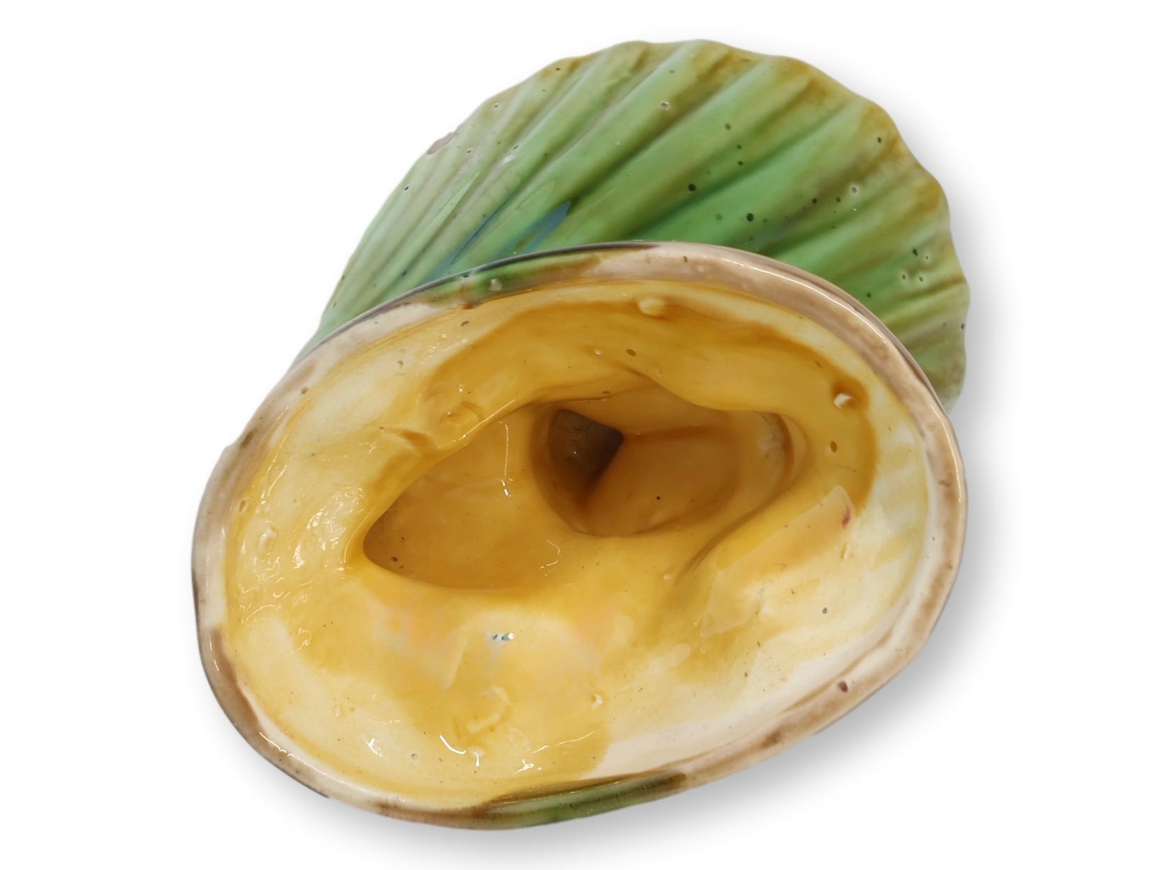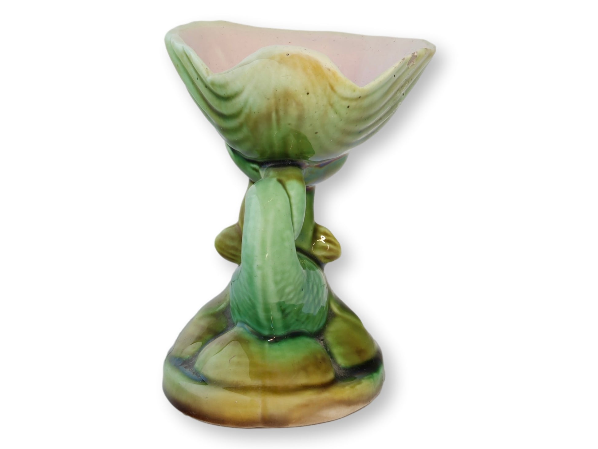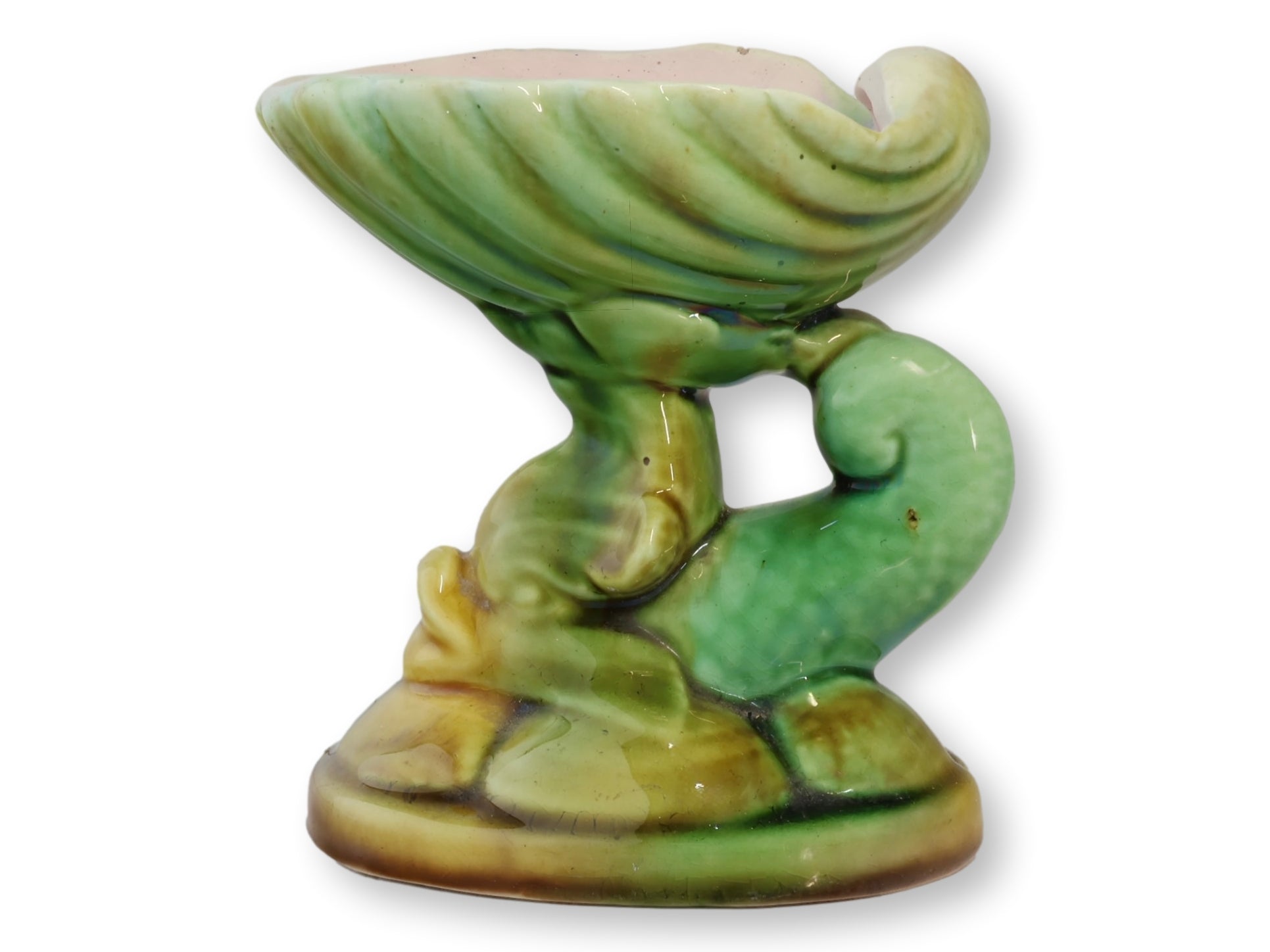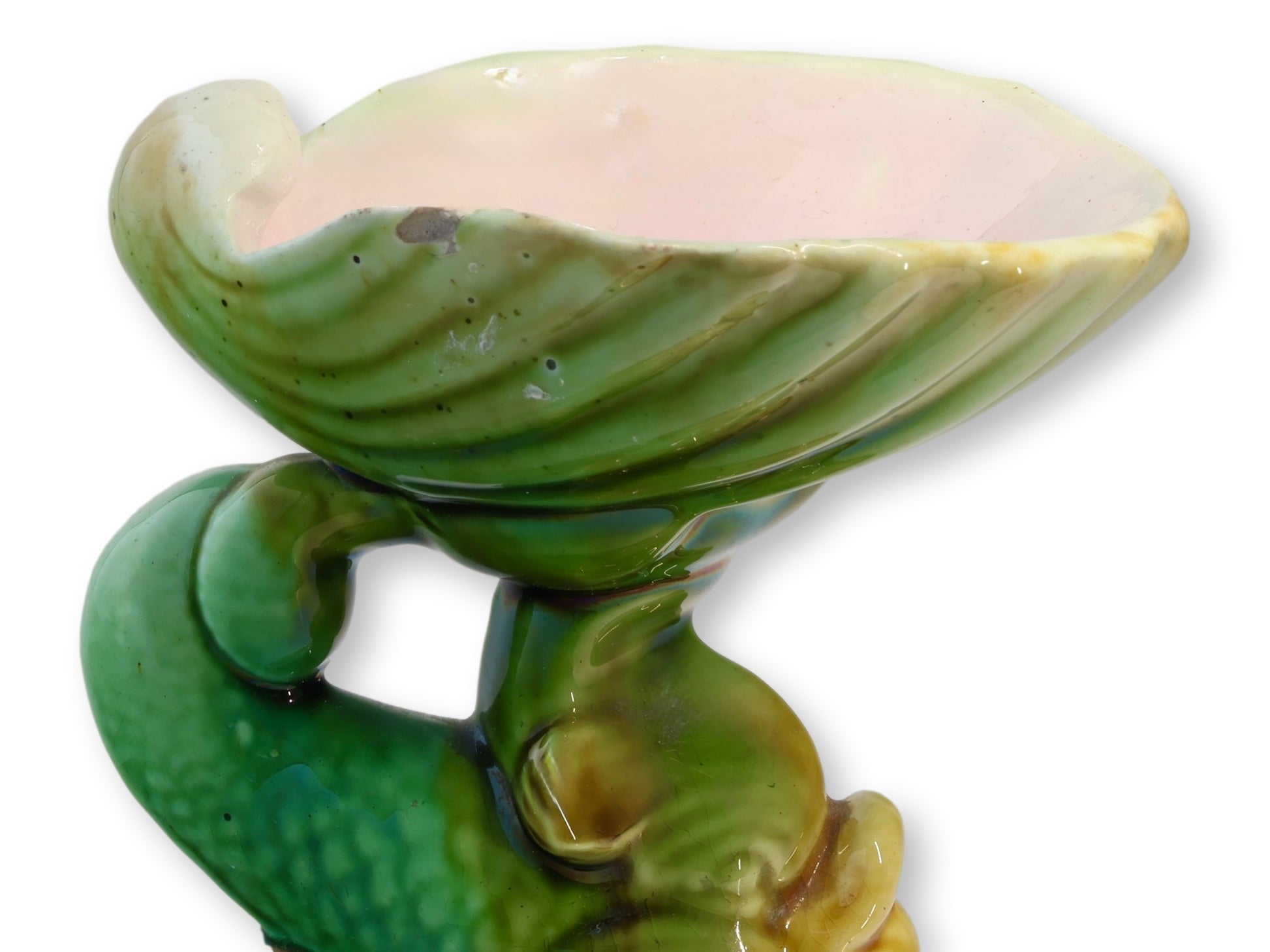 Charming 19th c. English majolica dolphin-form compote or spill vase. Rich green and ochre glaze highlights the scaly texture and whimsical shape, with a curled tail supporting a shell-form bowl. A fine example of Victorian majolica with excellent color saturation and gloss. Likely from Staffordshire or similar region, circa 1880. A perfect addition to a majolica or coastal-themed collection.