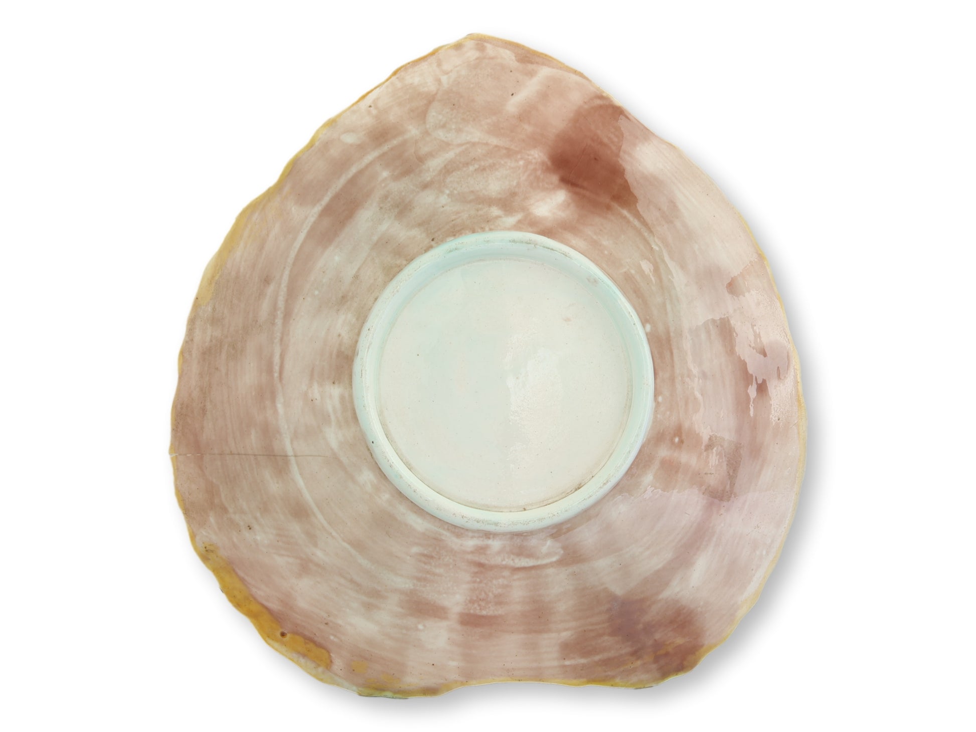 Late 19th-century English majolica plate in the form of a leaf, hand-glazed in rich tones of green, ochre, and chestnut with raised strawberry blossoms, fruit, and vines. Classic crazing, pooled glaze, and unmarked back typical of the era. A striking decorative piece with strong form and color—ideal for wall display or table styling.