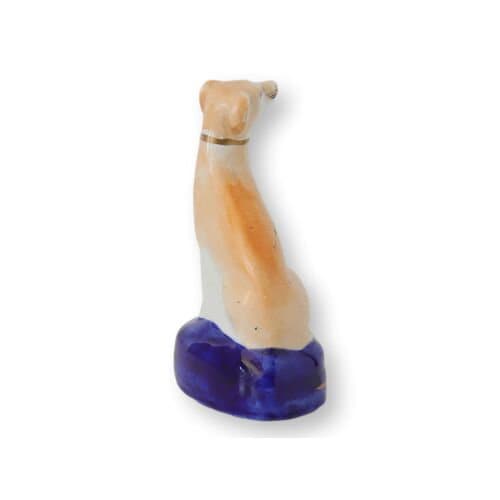 Mid-19th century Staffordshire spaniel with muted black and white coloring and expressive yellow eyes. Dating to circa 1850, this hand-painted ceramic figure features delicate molded fur, a classic gilt collar, and the distinctive naive charm collectors prize. These dogs were originally displayed on fireplaces or in cottage windows to signify loyalty or welcome.