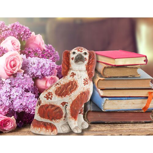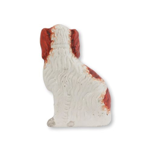 This antique Staffordshire spaniel figurine is a charming tribute to "Dash," Queen Victoria's beloved King Charles Spaniel. Designed to capture the breed's endearing qualities, the piece reflects the deep bond between the queen and her cherished companion.