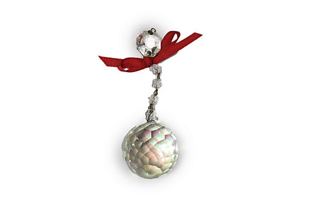 Elegant antique French chandelier ornament featuring a beautifully cut crystal ball suspended from a red ribbon. This striking drop once adorned the central base of a 19th-century chandelier, where it would have caught and reflected candlelight in dazzling patterns. A remarkable example of fine French craftsmanship from the mid-1800s, it now serves as a timeless decorative accent or a stunning standalone piece.