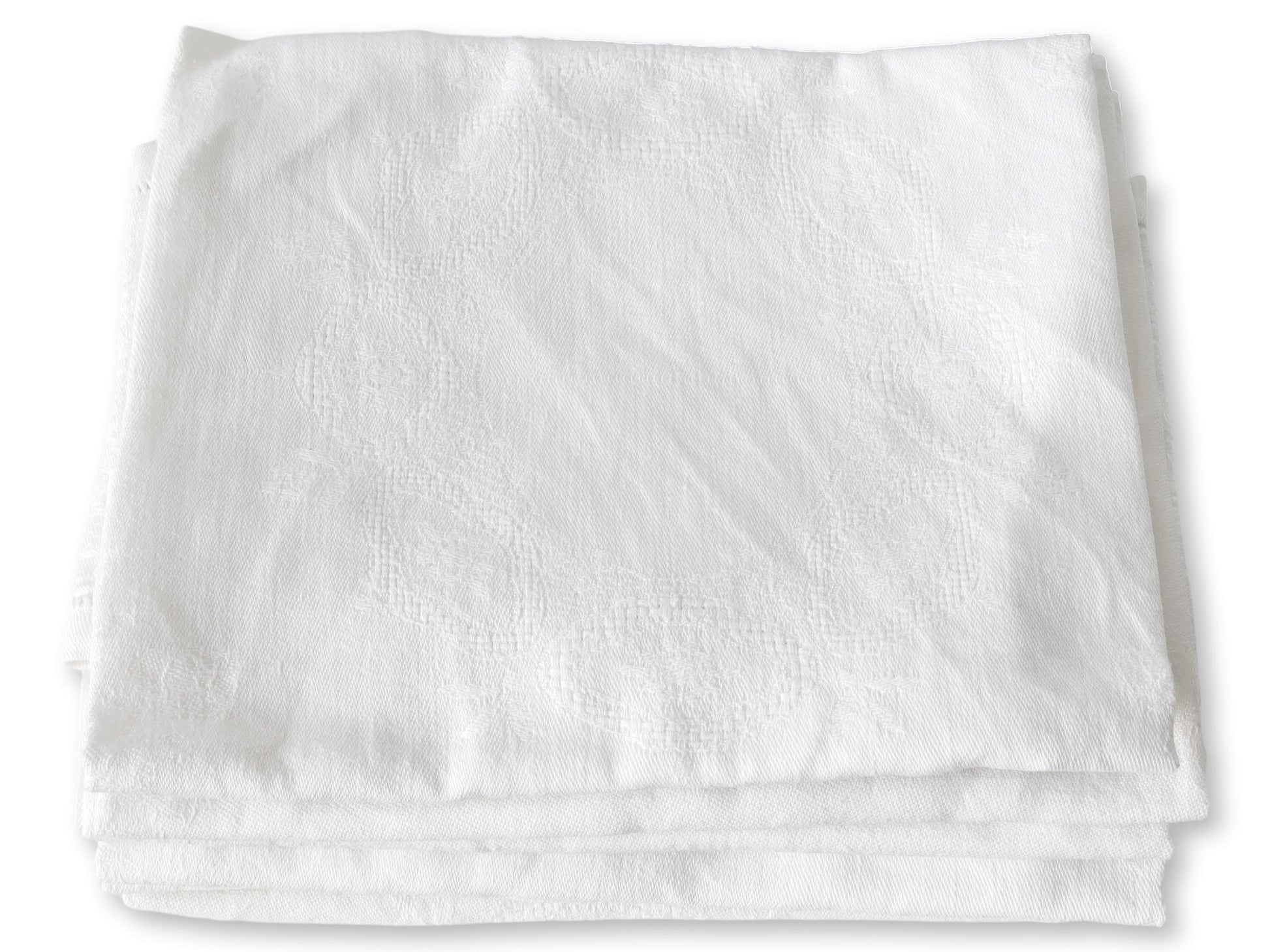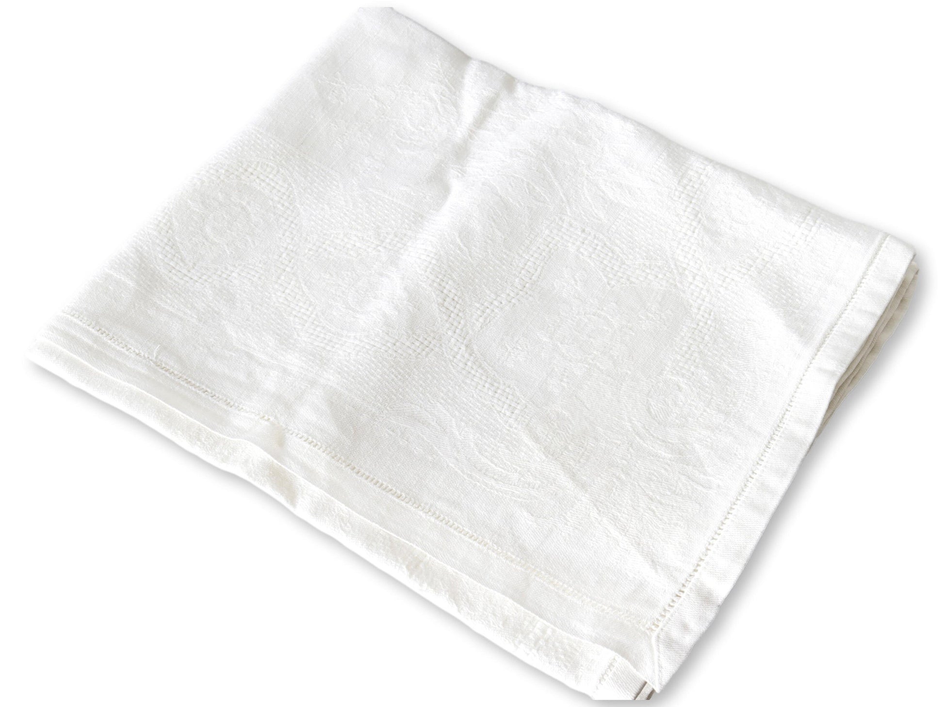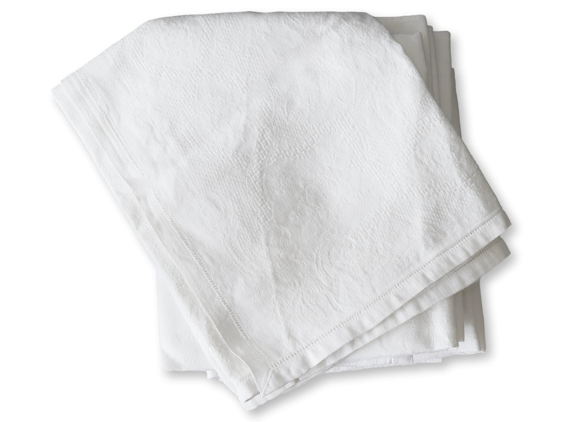 Set of eleven antique French dinner napkins. Pattern on pattern damask fabric with finely hand-stitched ladder work edges. They have survived the century in very good condition and have remained bright white. Some have a small red monogram on the edge, typical of antique French linens. Often, this stitching is for identifying when sent out to laundry.