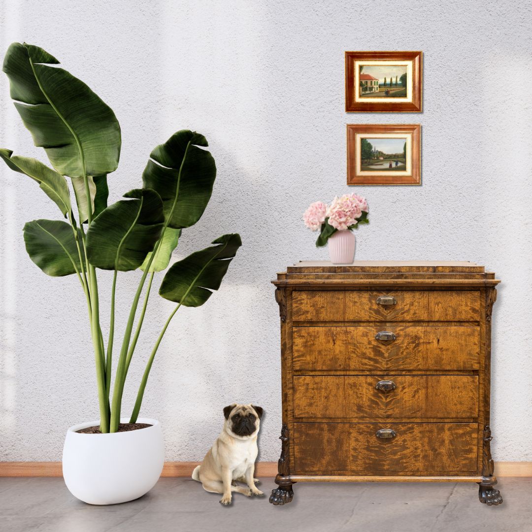 Antique painting on board depicting a tranquil lakeside scene where a man and woman in period dress stand at the water’s edge, the man gesturing across the calm surface. A simple wooden boat rests on the opposite bank, while in the distance church spires and red-roofed cottages rise above the trees, giving the work a distinctly French village character. The composition’s soft greens and blues create a serene atmosphere, and its naïve, folk-art style adds a charming, timeless quality. Presented in a later gilt frame with new wood and paper backing, the painting itself remains untouched, preserving its authentic antique appeal.