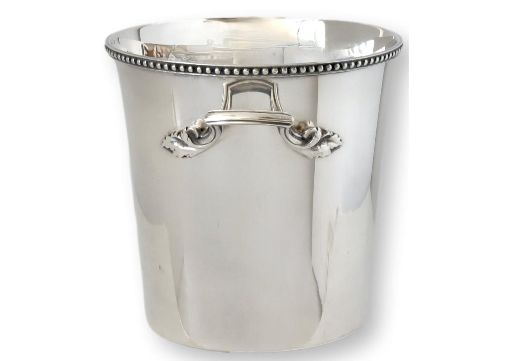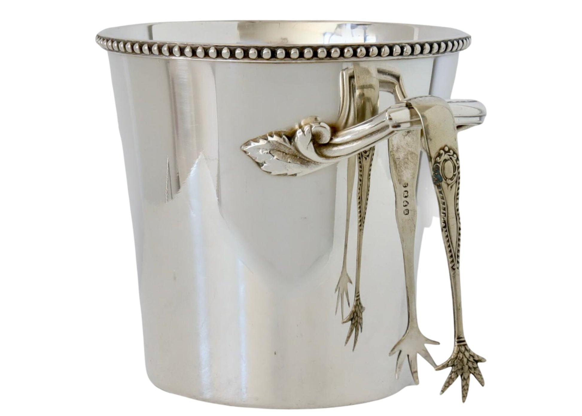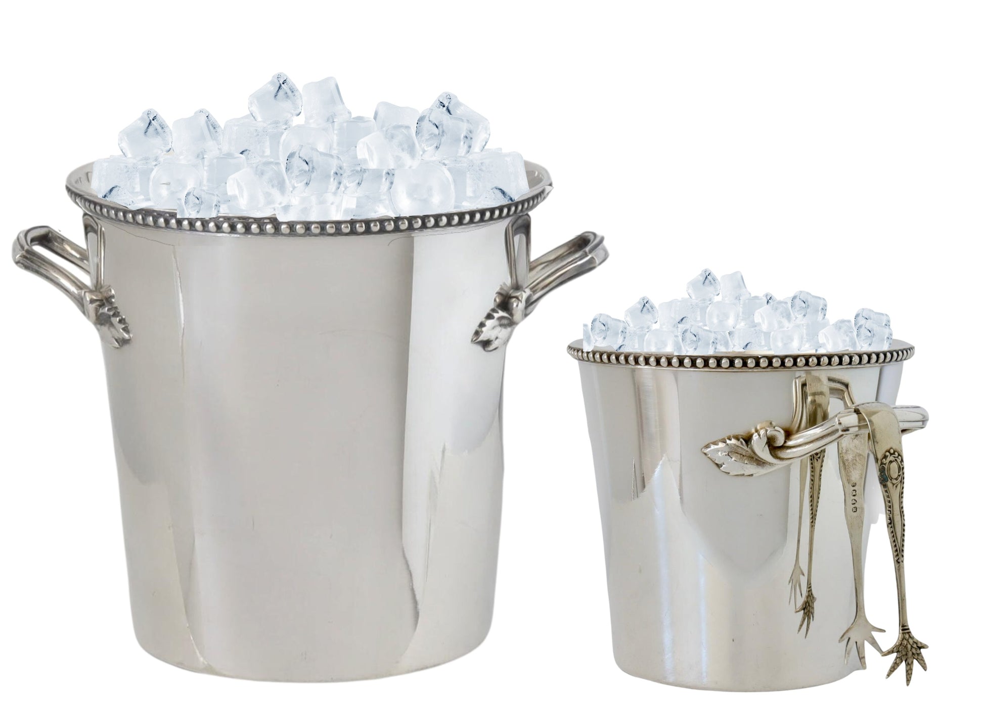 Crafted with precision, this three piece French silver-plate barware set includes champagne bucket, ice bucket, and ice tongs, all boasting exceptional quality and weighty silver-plating. Tongs are English. Both buckets bear a French silver-plate hallmark on underside, ensuring authenticity and timeless elegance for your special occasion.