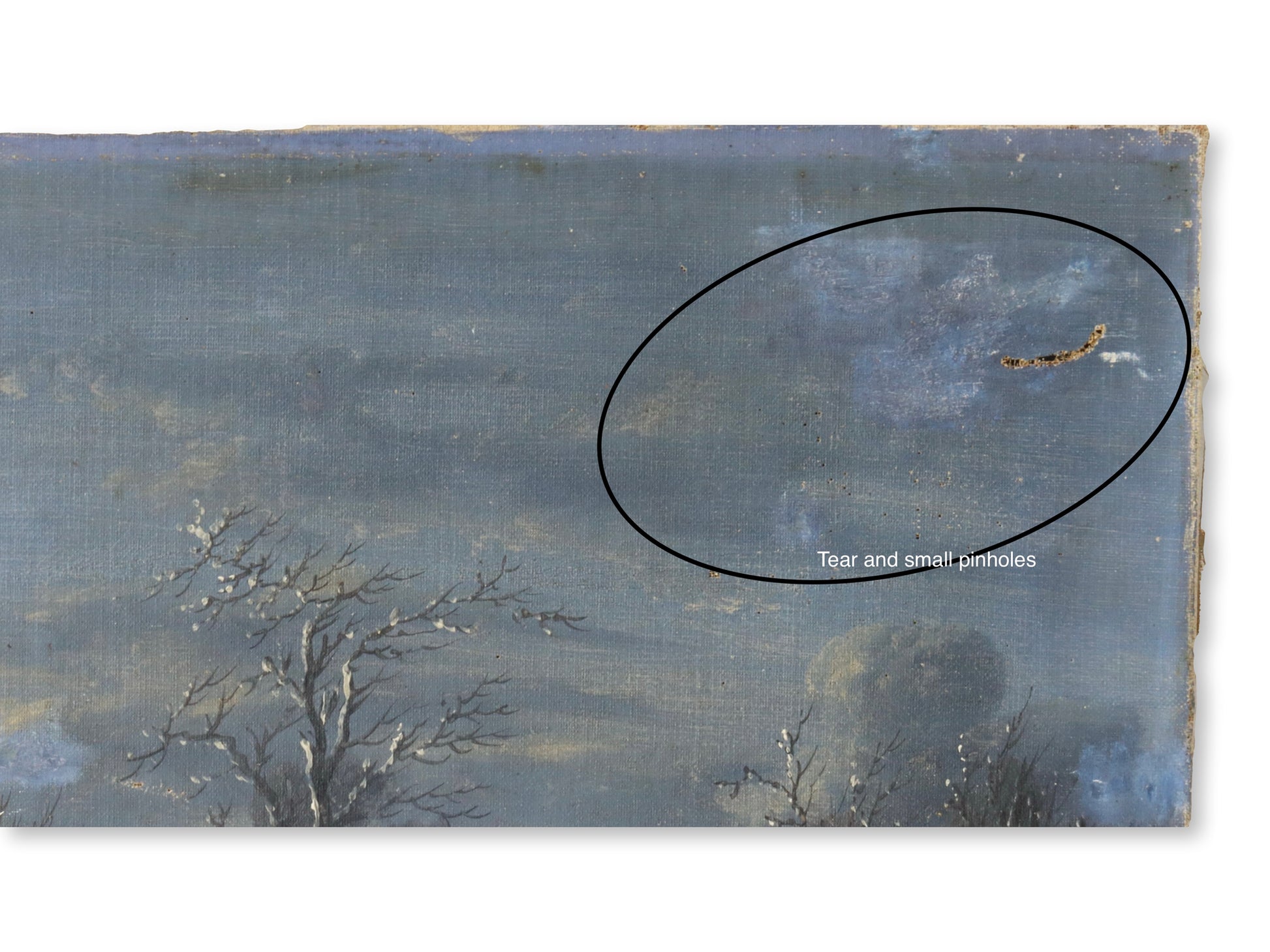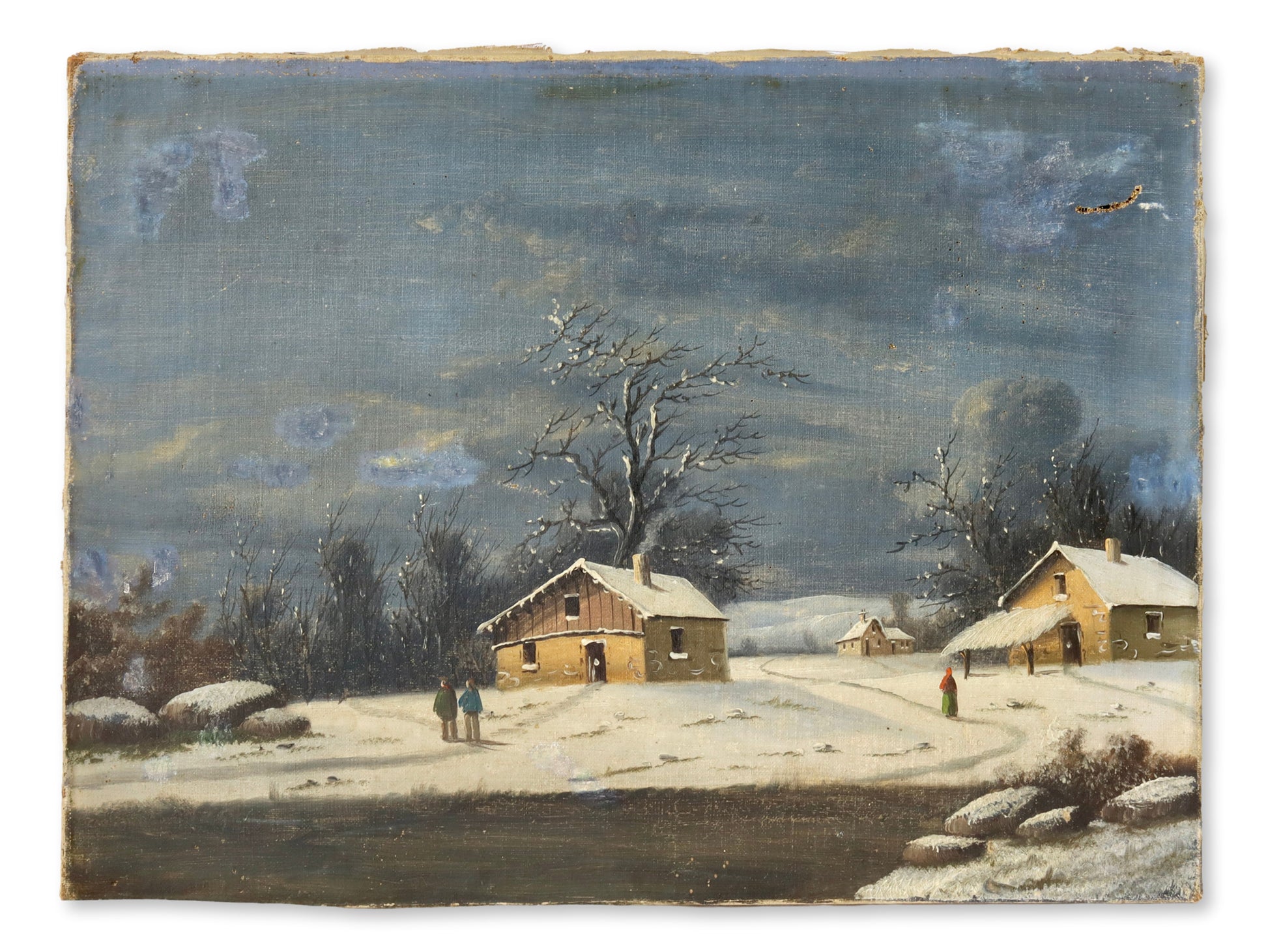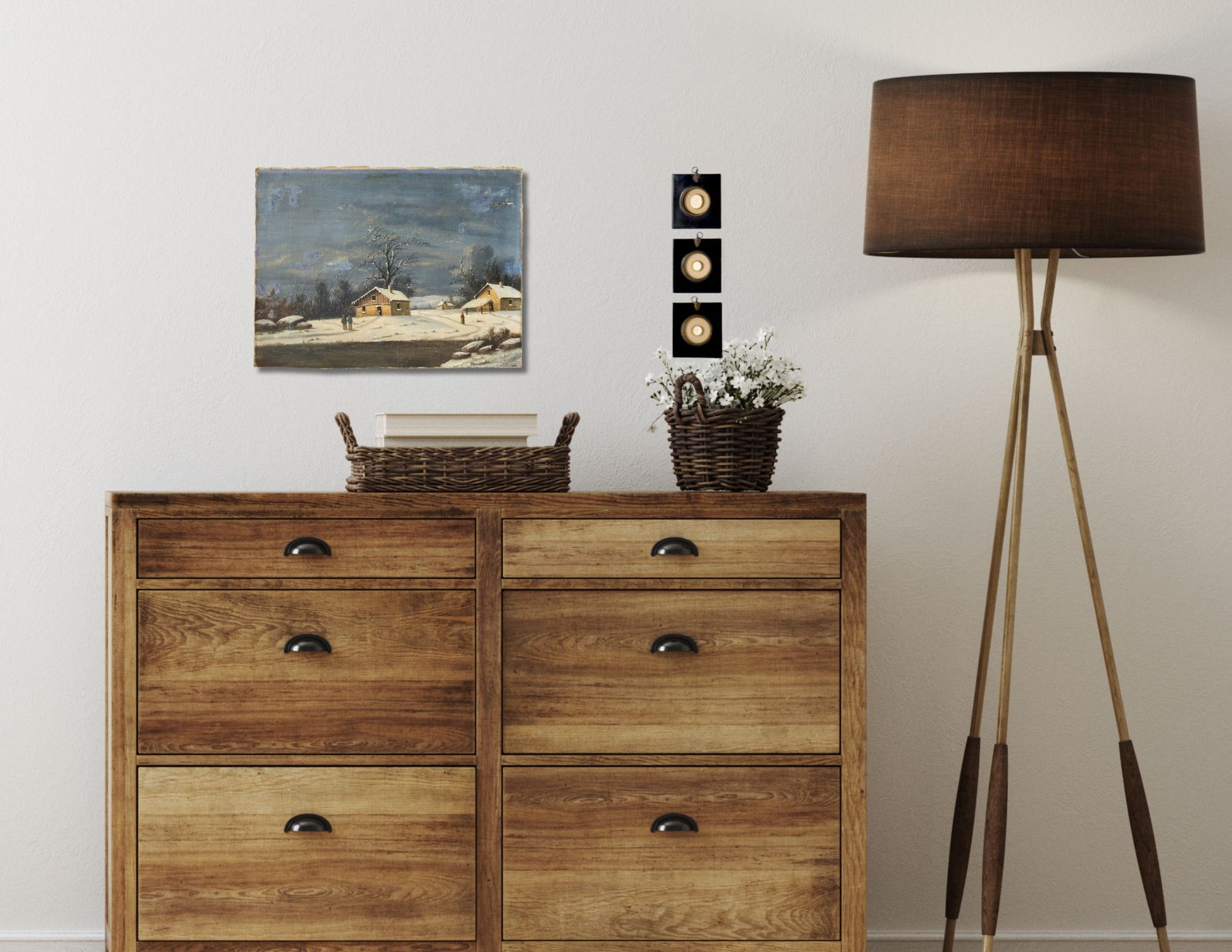 Capture the serene beauty of winter with this antique French rural farm snow scene. This unframed oil on canvas painting features a charming depiction of a snowy countryside. The piece shows some flaws on the canvas, adding to its rustic character. Perfect for adding a touch of rustic elegance to any room, ideal for collectors and art enthusiasts.