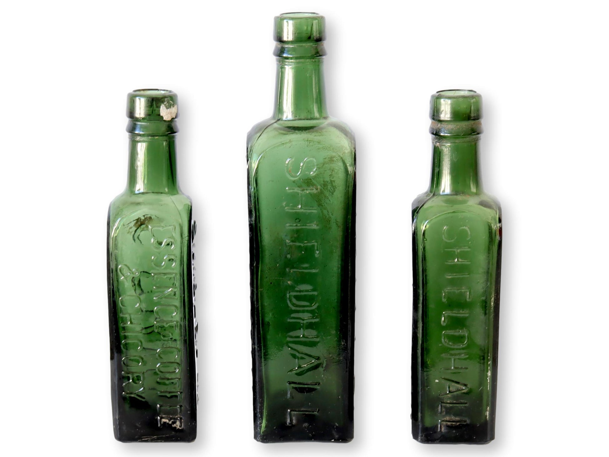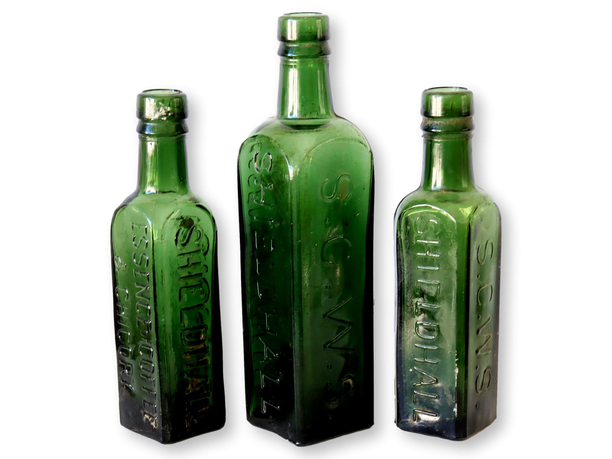 Set of 3 green glass bottles with raised lettering on sides. Essence of Coffee & Chicory in raised lettering. SCWS on one side which stands for the Scottish Co-operative Wholesale Society. On another side it says Shieldhall which was the factory where the bottles were manufactured.