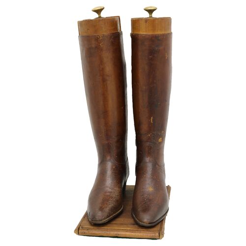 The boots retain their warm, aged patina and subtle creasing from years of display, while the slender form reflects the refined style of the period. A striking decorative object that captures the spirit of English equestrian tradition—equally at home in a study, library, or gentleman’s dressing room.
