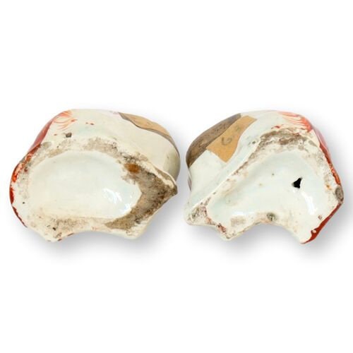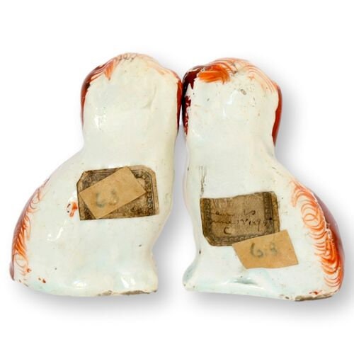 A petite pair with royal provenance. These antique English Staffordshire spaniels were modeled after Queen Victoria’s beloved dog, Dash, and became wildly popular throughout her reign. Highly collectible today, this pair was once part of a museum collection and still retains its original inventory stickers on the underside (easily removed if desired). As with most early Staffordshire, no maker’s mark.