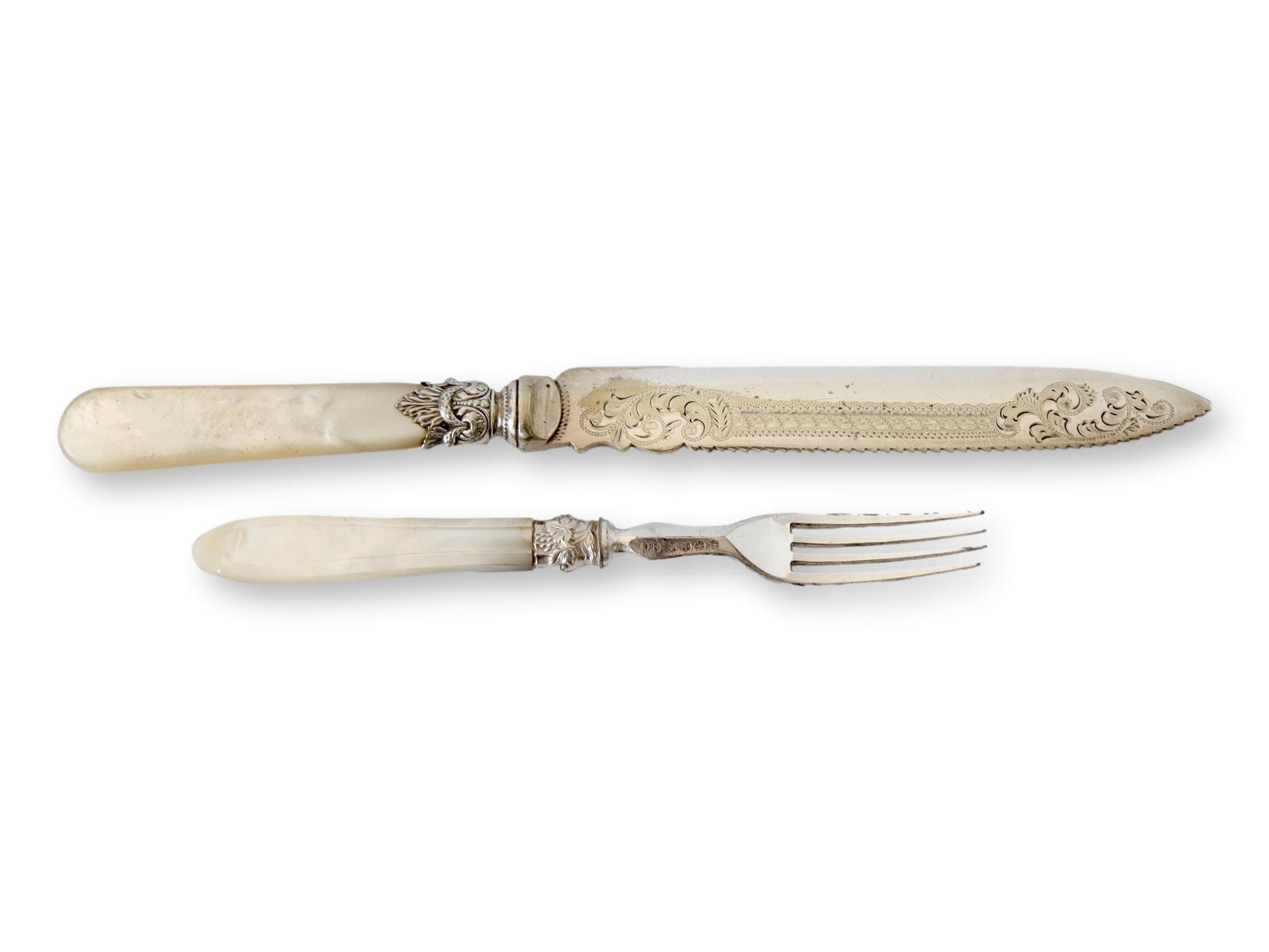 Antique English mother-of-pearl cake serving set. It includes six matching cake forks measuring 7"L x .5"W x .25"H with mother-of-pearl handles and engraved pattern blades, all impressively adorned with fancy silver cuffs. Made of silver-plated nickel silver and marked as such. The silver on the knife blade has been polished over the years down to the more champagne color nickel underneath (see photo).