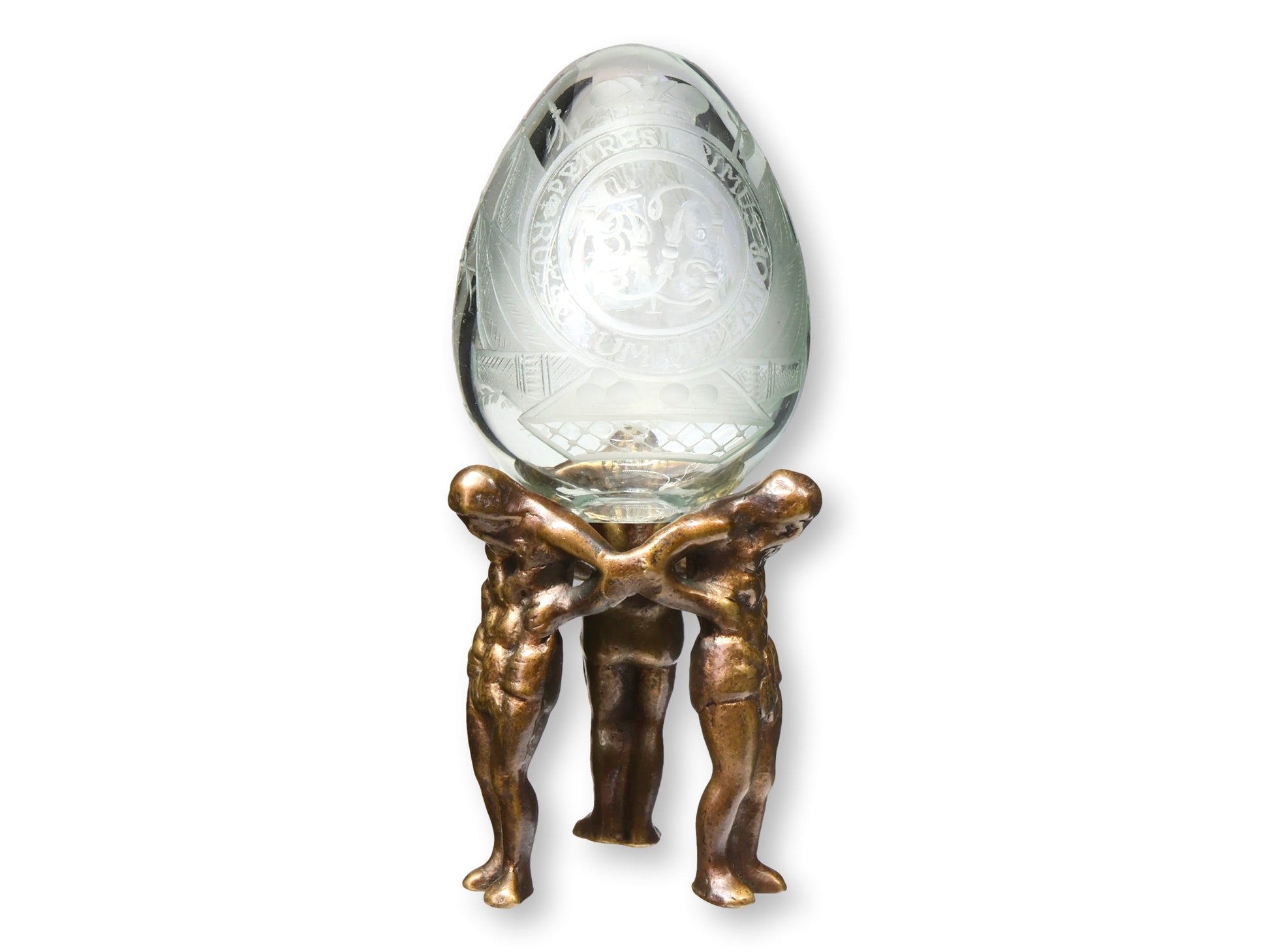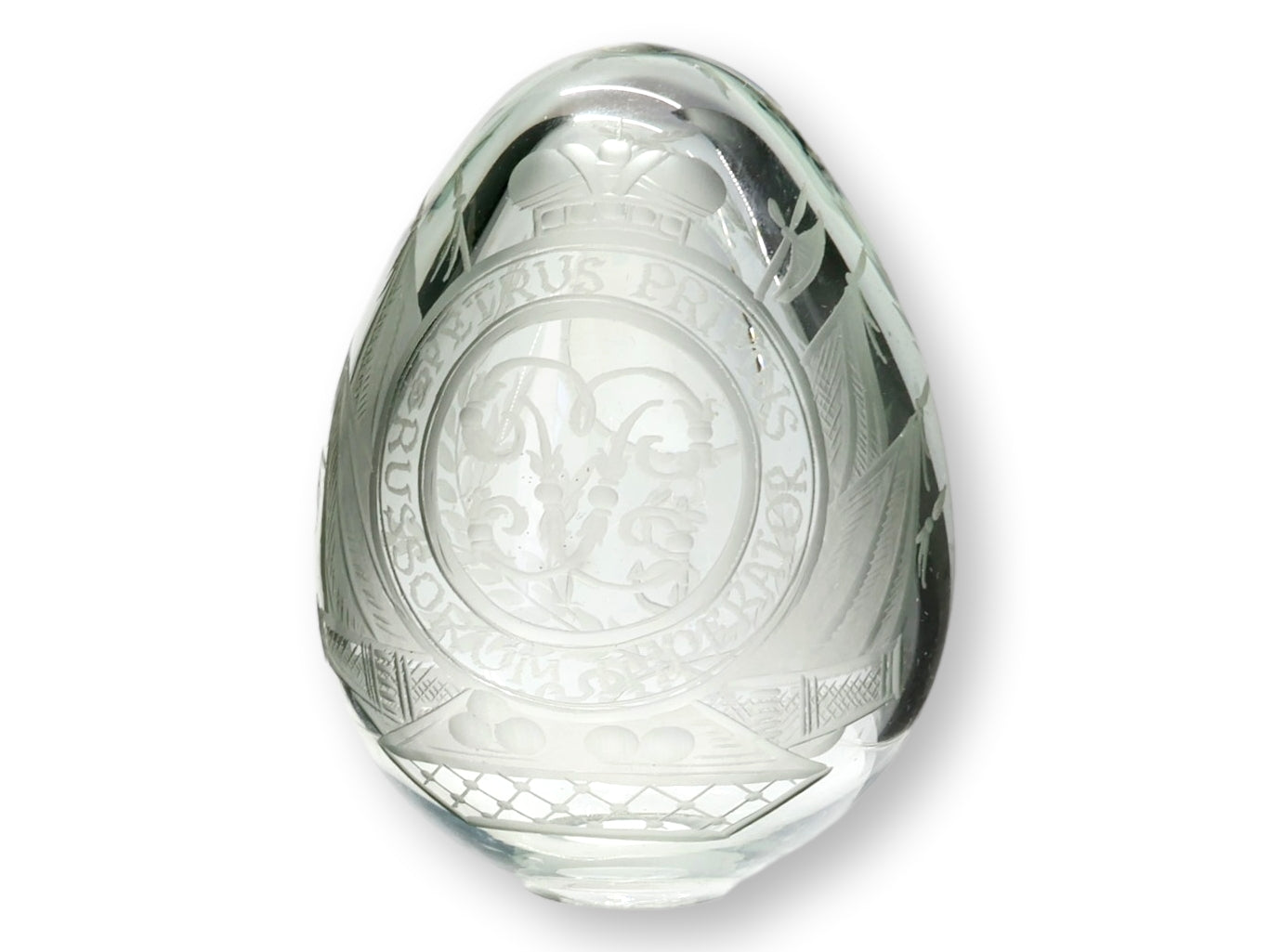 Superbly cut and engraved Russian Imperial glass egg, featuring an elaborate central medallion inscribed in Latin "PETRUS PRIMUS RUSSORUM IMPERATOR" - "Peter the First, Emperor of the Russians." Surrounded by laurel wreaths, anchors, sails, and naval motifs, the piece celebrates Peter the Great's maritime legacy and the founding of St. Petersburg as a naval power. It reflects the artistry of late 19th-early 20th century Russian glassmaking, rich with Imperial history and nautical symbolism.
