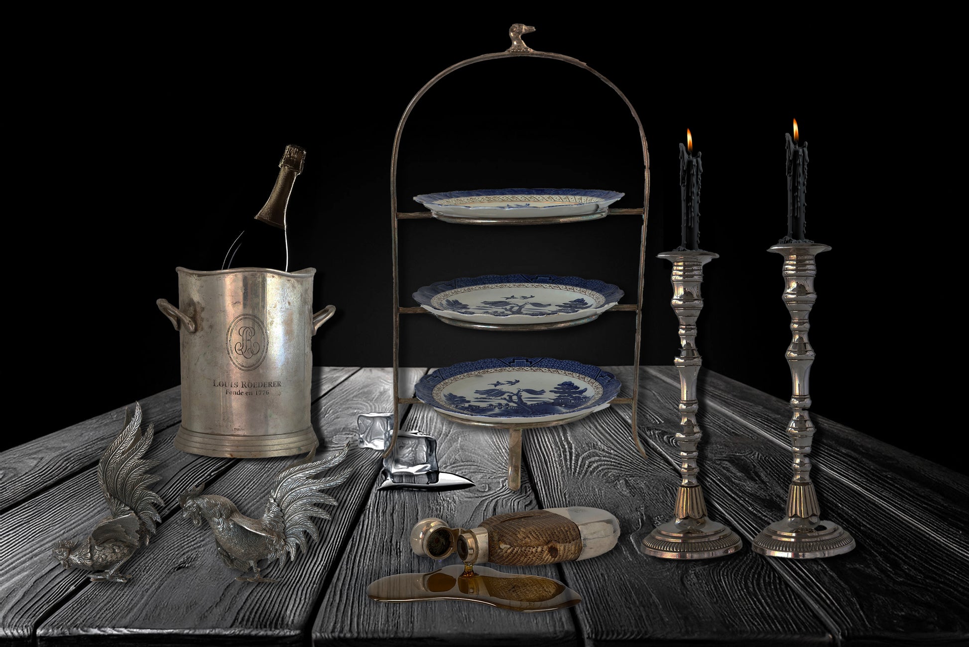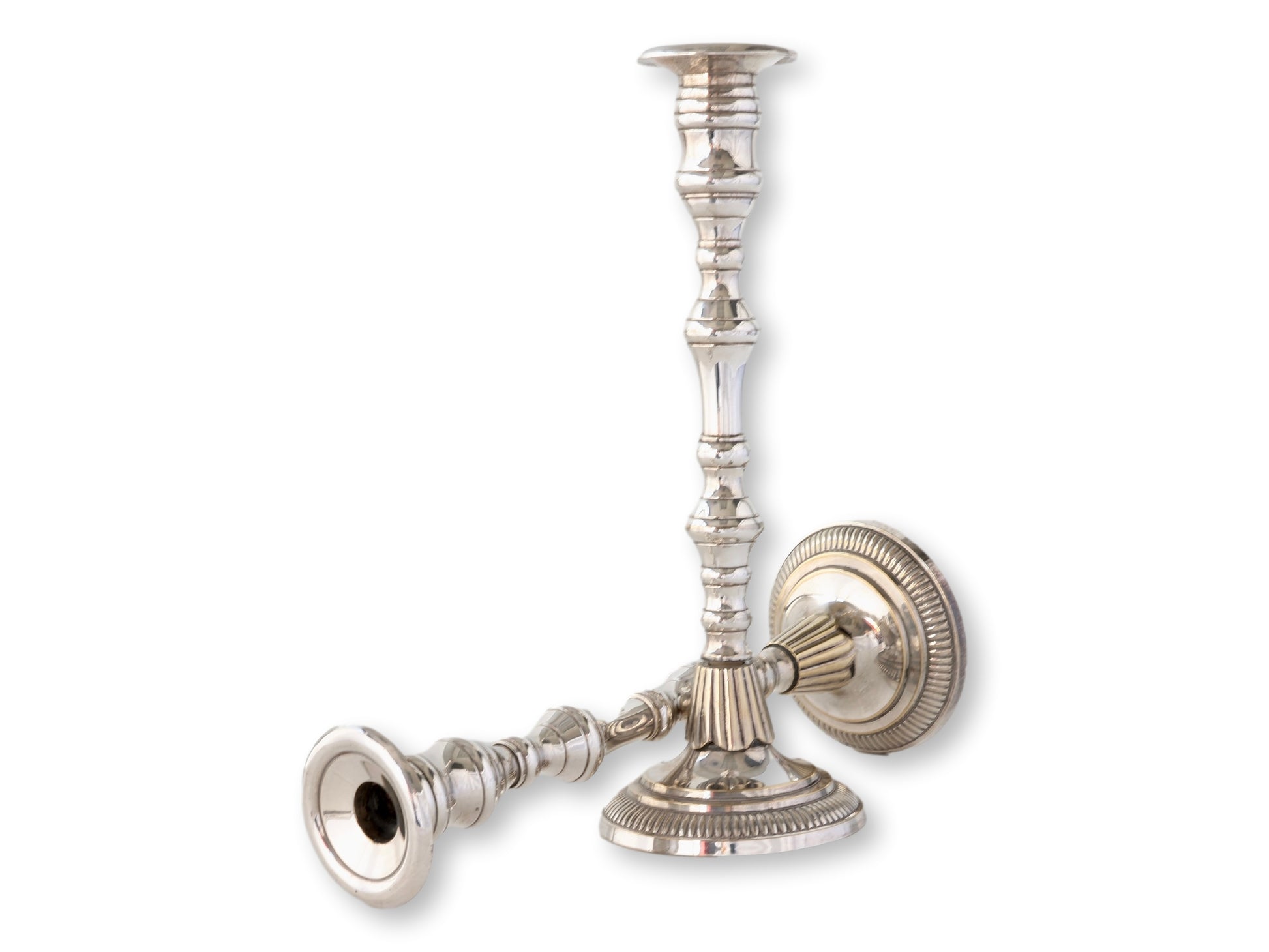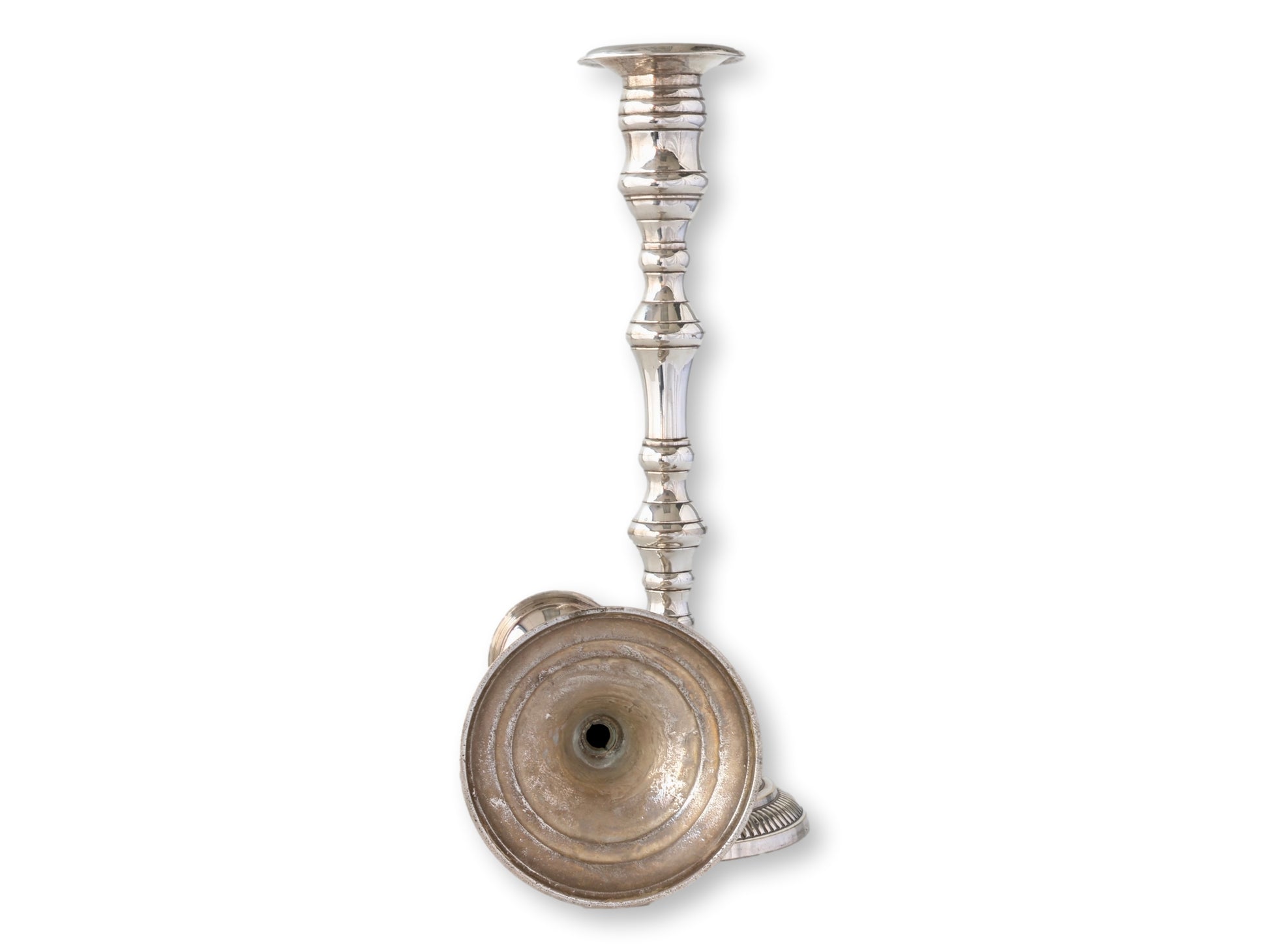 Unusual pair of tall mid-19th-century English candlesticks, silver-plated over brass—a rare combination for the period. Substantial in weight and presence, with elegant turned shafts and fluted bases. Taller than typical examples and unmarked, they offer timeless appeal and understated drama for mantel or tabletop.