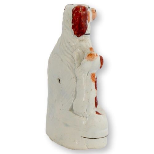 Mama’s got company—and he’s halfway up her side! This 19th-century English Staffordshire poodle figurine features a sweet red and white mother dog with one adventurous pup climbing right up her hip. A charming tribute to Victorian affection for dogs (and drama), these figures were popularized as parlor shelf décor and were often modeled without marks. This one’s got all the early hallmarks: wonderful glaze, hand-painted detail, and just the right amount of sass.