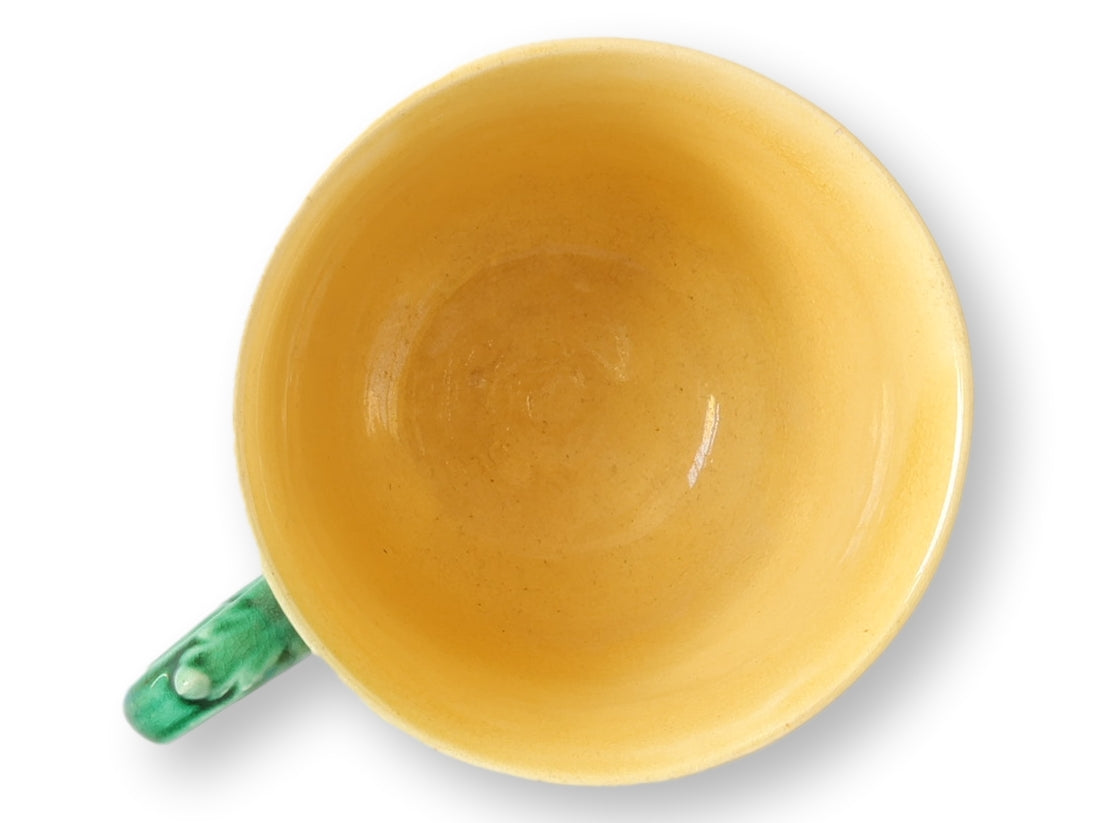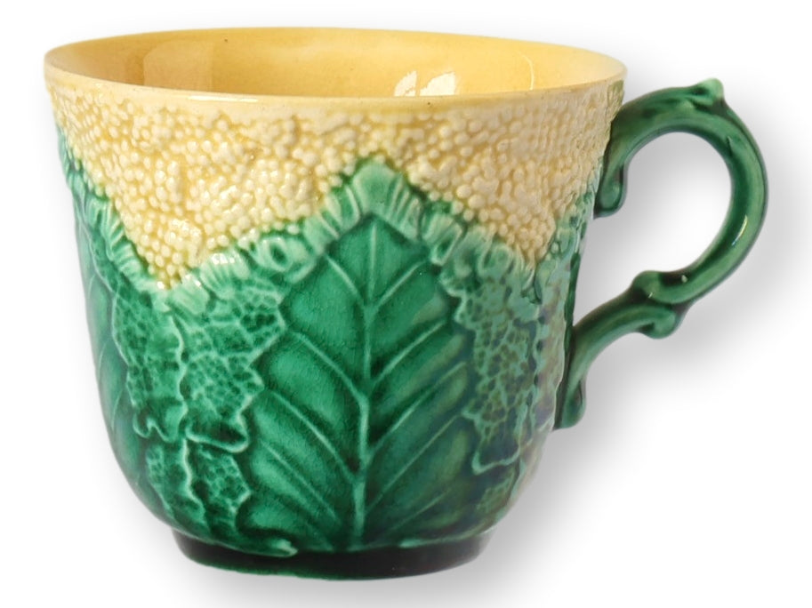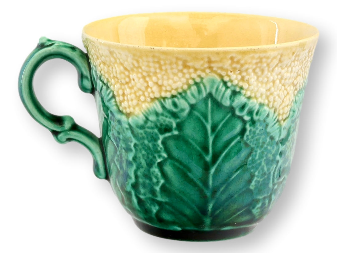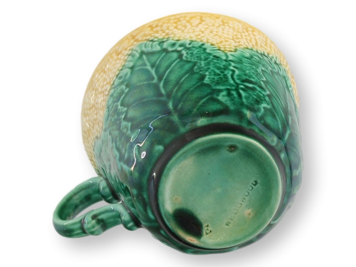 A beautifully glazed 19th-century majolica cup by Wedgwood featuring a raised sunflower-and-corn leaf pattern, glazed in rich greens and golden yellow. A classic Victorian design and hard-to-find pattern. Stamped WEDGWOOD on the base.
