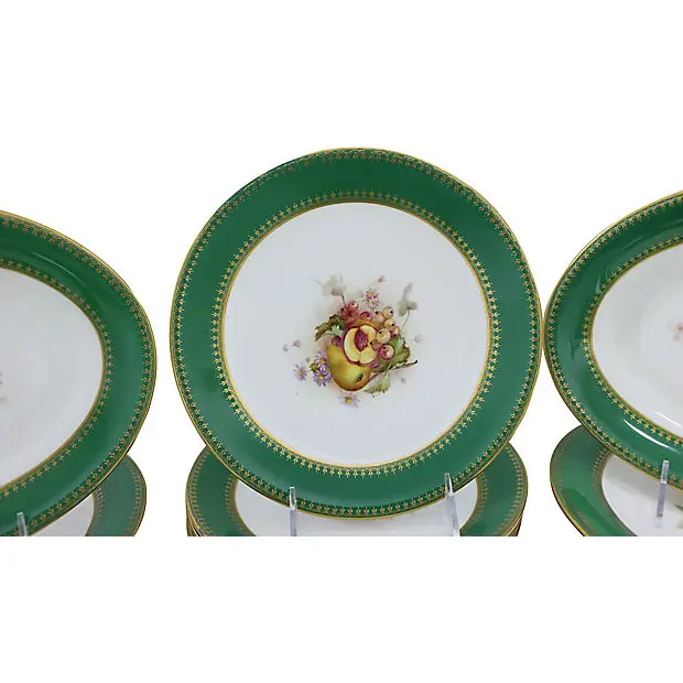 Eighteen piece Royal Worcester serving set. Green border with hand-painted fruit and flower centers. Includes two comports, two oval dishes, two square dishes, and twelve plates. Dimensions: comports, 9.25"Dia x 4.25"H; oval serving dishes, 10.5"L x 7.75"W x 1.25"H; square serving dishes, 9"L x 9"W x 1.5"H; plates, 9"Dia x 1"H. Maker's mark on underside. Light wear, minor flakes to gold edge.