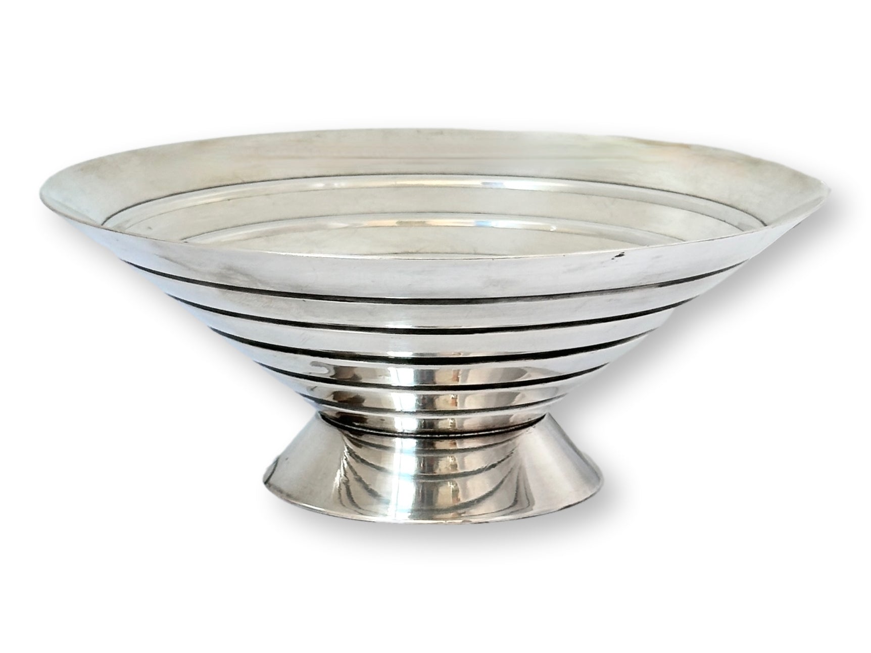 A bold example of Art Deco design, this English silver-plated centerpiece bowl features dramatic stepped banding, a flared profile, and a weighted pedestal base. Typical Sheffield wear with minor copper show-through. Both sculptural and functional.