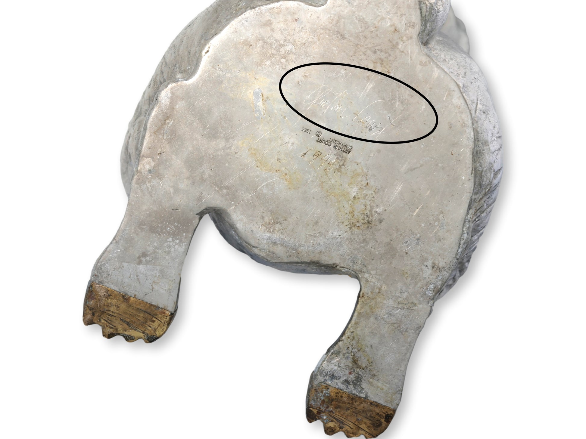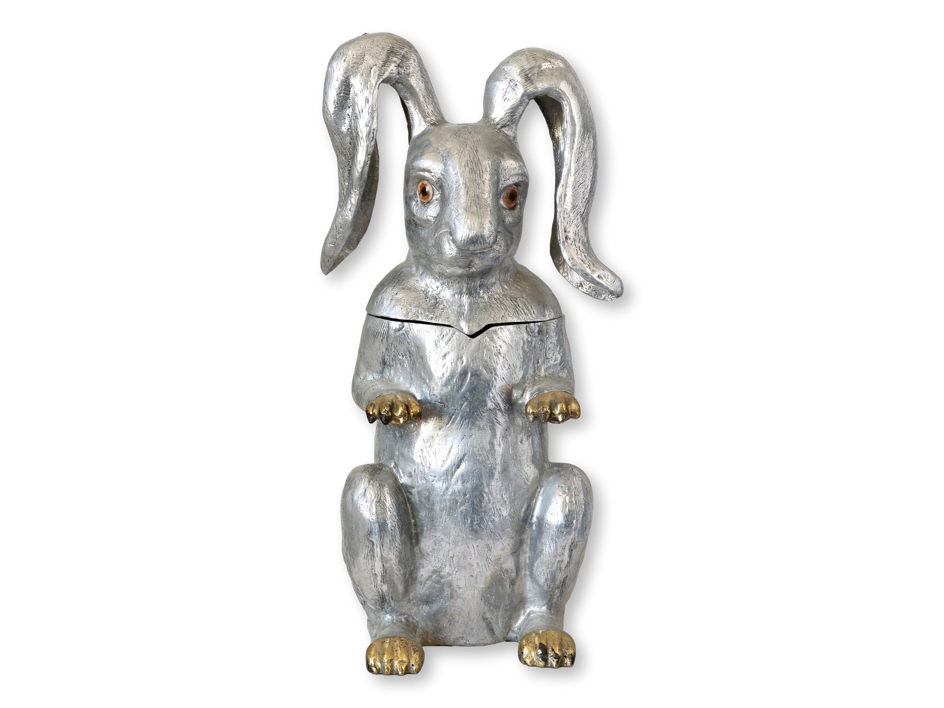 The party doesn’t start until he hops in. This extraordinary Arthur Court rabbit ice bucket is a feat of whimsy and craftsmanship — cast in silvered metal with a hinged head, gilt paws, and mesmerizing glass eyes. Signed and dated 1976, it’s one of Court’s most collectible and theatrical barware designs. The unlined metal interior is watertight and sturdy, making it equal parts functional and fantastical. A statement piece for those who prefer their soirées with a wink.