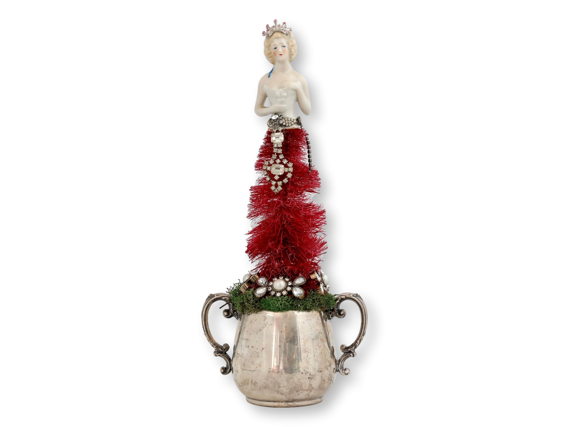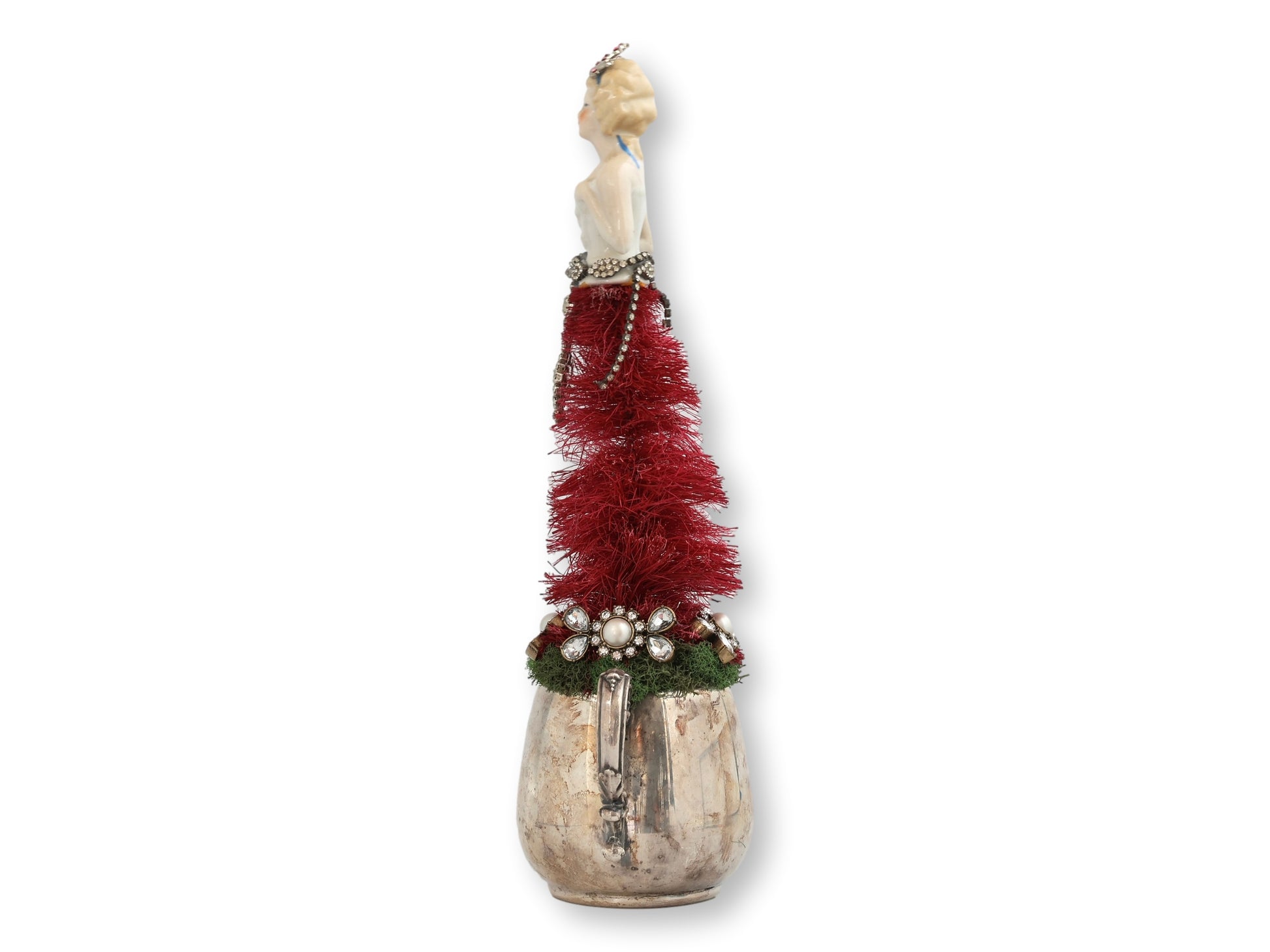 This dazzling holiday tree is giving full Queen energy. An antique porcelain brush doll crowns the top, reimagined as a pageant starlet with jeweled waist detailing and rhinestone accents. Her crimson bottle brush “gown” cascades into a vintage silver-plate sugar bowl base with the perfect touch of patina. A show-stopping piece of holiday artistry, she blends Hollywood glamour with festive sparkle — destined to reign over mantels, buffets, or bar carts with unapologetic flair.