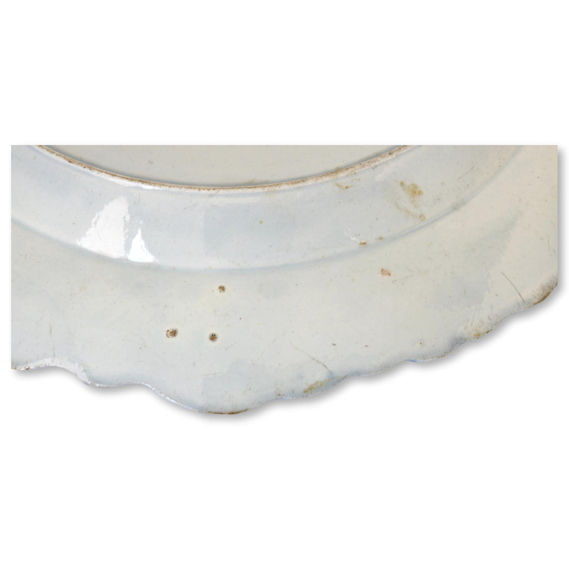 18th century English earthenware plate with pearlware glaze. Pattern is known as "Long Liza", featuring mysteriously tall draped figure. This one is most unusual with raised festoon pattern on edges. Dating to c. 1780-90. Exceptional in both quality and condition, with only fine, minor flaws typical of this type of pottery The "Long Eliza" pattern derives from early 17th/18th century Chinese porcelain.