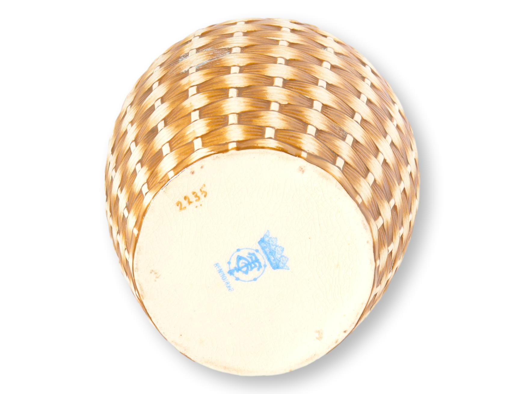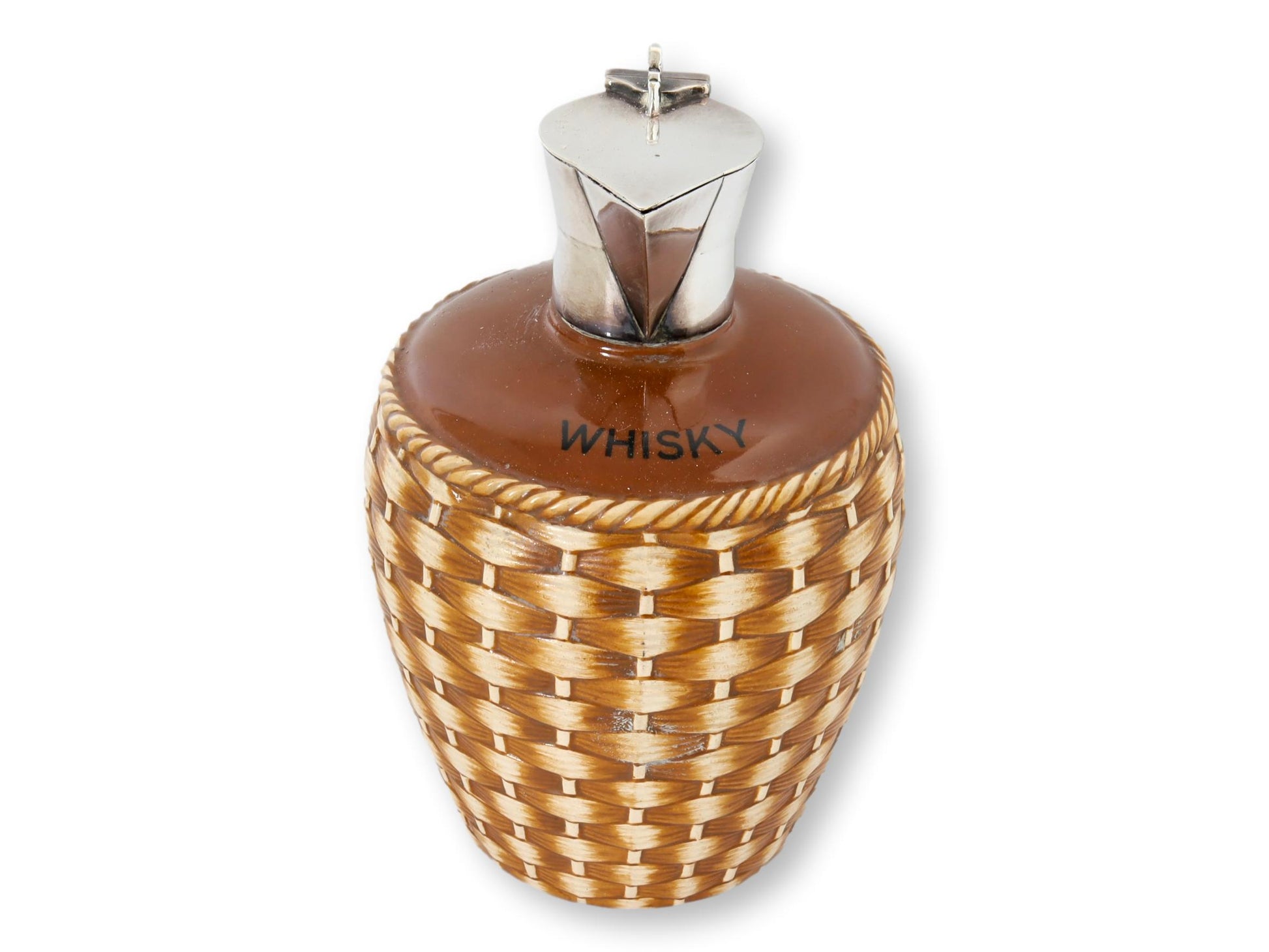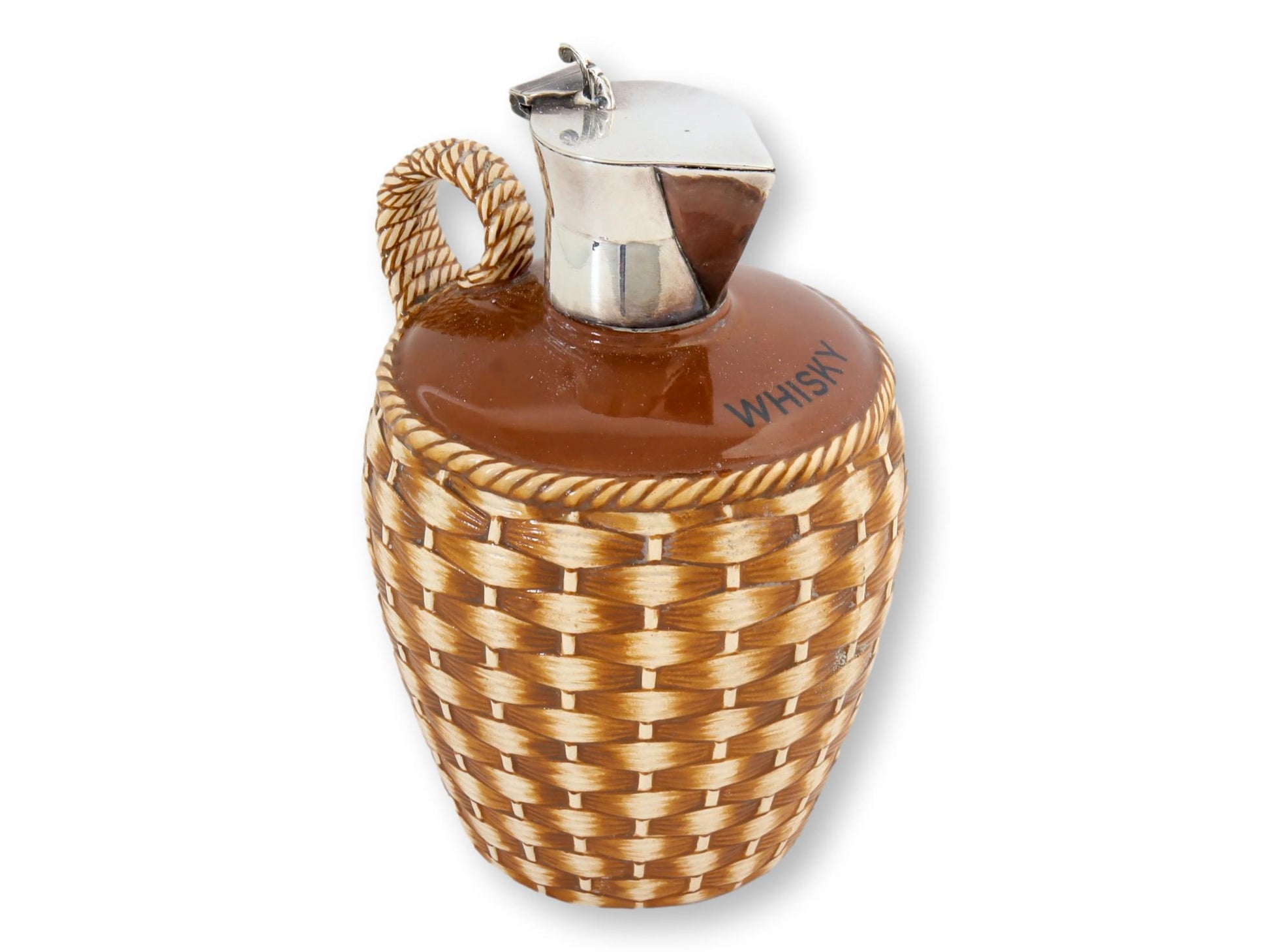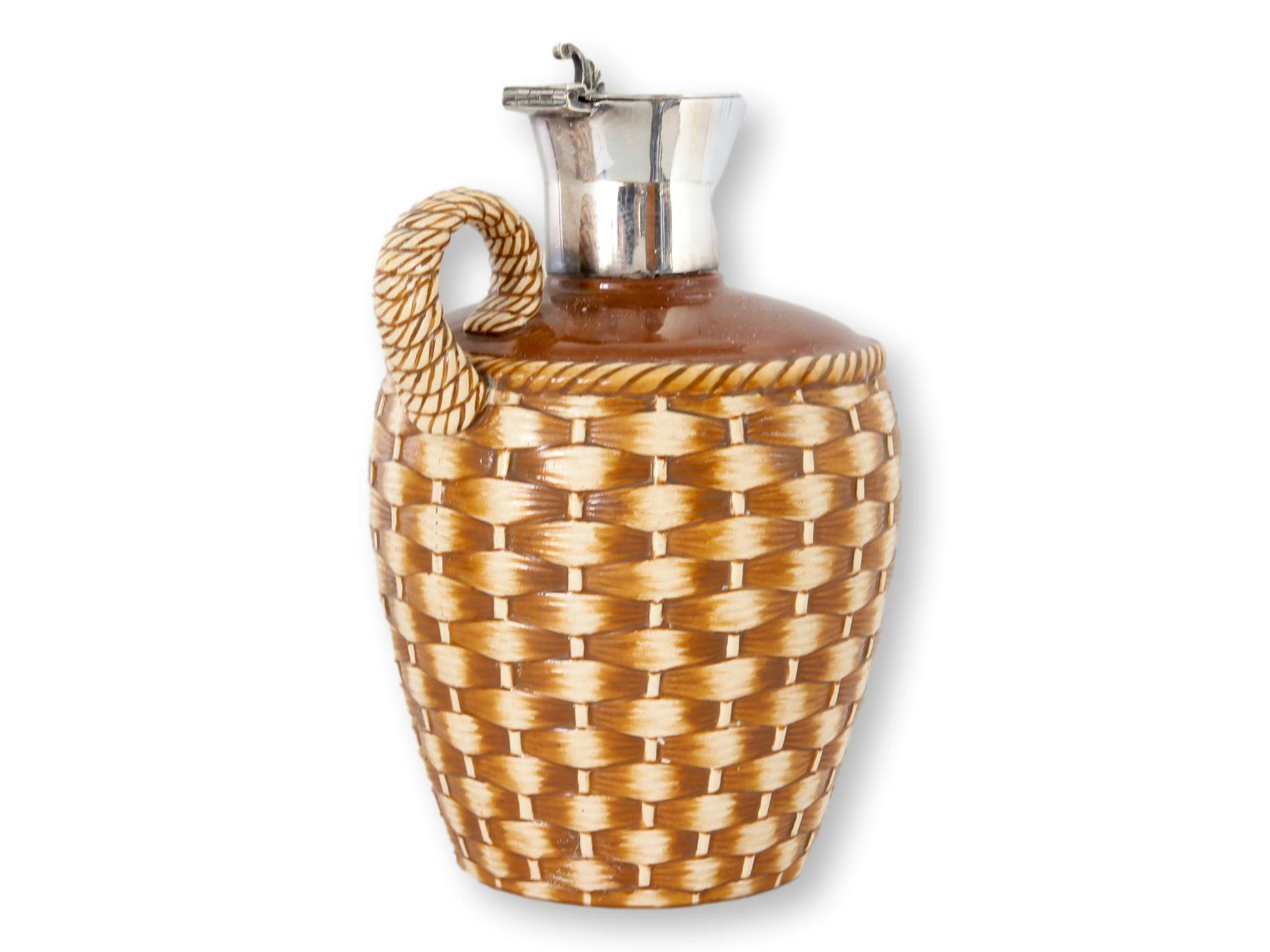 Circa 1880, this rare and highly collectible English Victorian whiskey decanter showcases detailed ceramic craftsmanship with a trompe-l'oeil woven design, topped with a lustrous silver-plate spout. A distinguished addition to any barware collection.