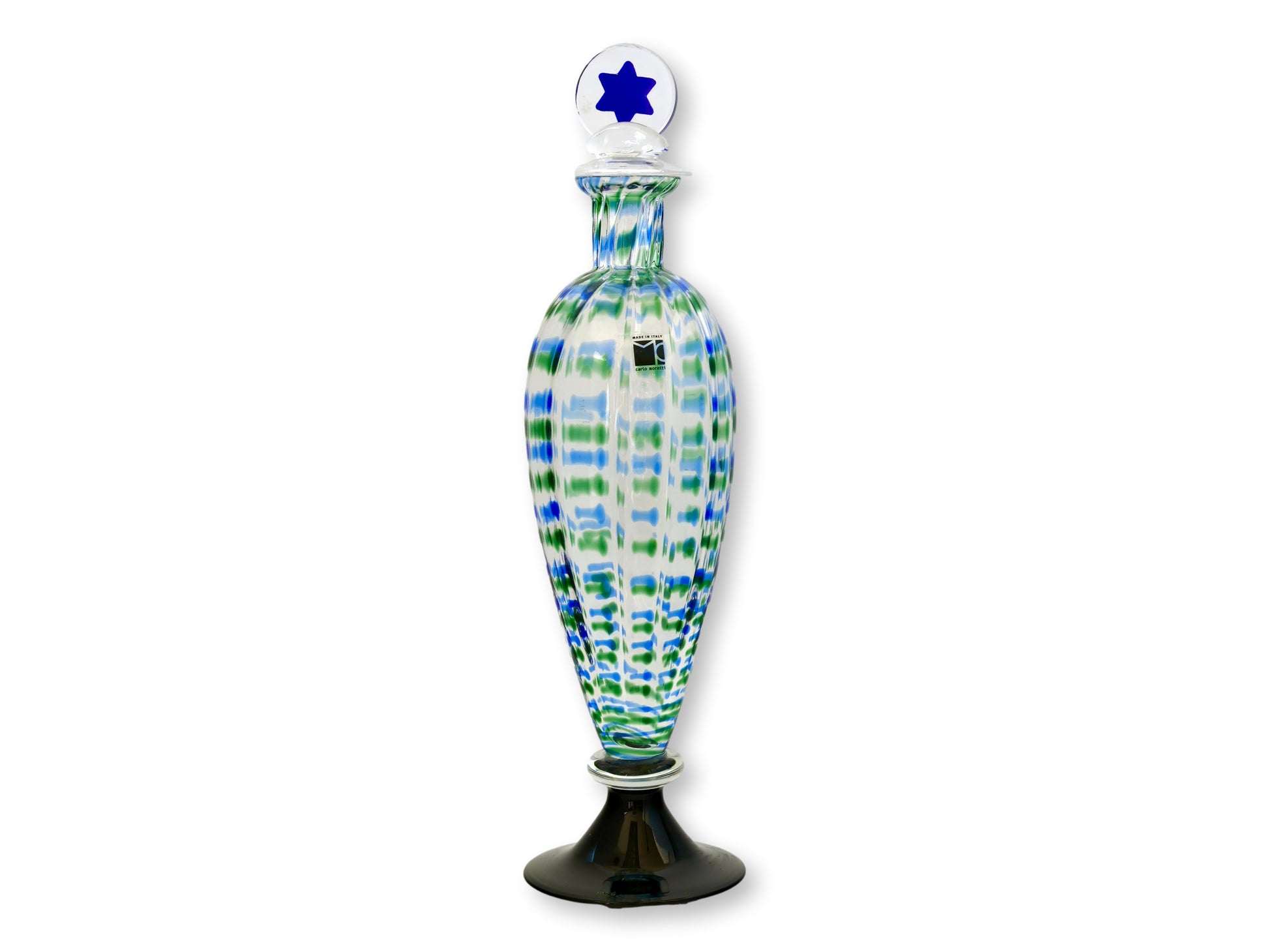 A striking Carlo Moretti Murano glass carafe, hand-blown on the island of Murano and signed on the base. The elongated, tapered form showcases Moretti’s signature mastery of color and form, with layered ribbons of translucent green, cobalt blue, and white. Retains its original label. A sculptural statement piece for any bar or console, marrying Italian craftsmanship with modern artistry.