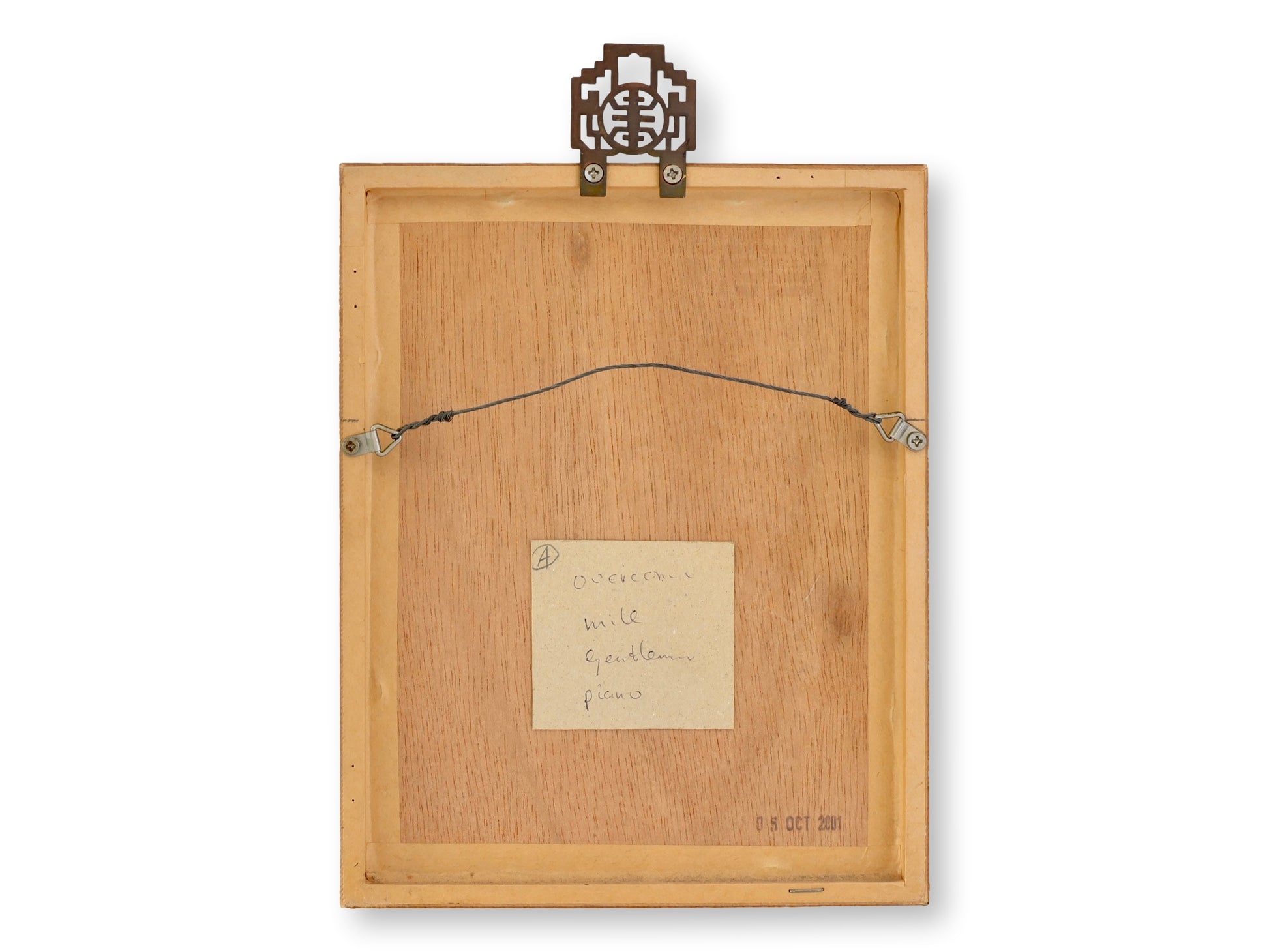 Original Chinese ink calligraphy spelling out “Christian.” The characters 克 (kè), 里 (lǐ), 斯 (sī), and 琴 (qín) together form the phonetic translation and convey meanings like “to overcome,” “reason,” “refined,” and “instrument” or “melody.” Signed by the artist and dated 2001 on the back. Framed in faux bamboo with a chinoiserie crest, it’s a cultured, personal touch for any space.