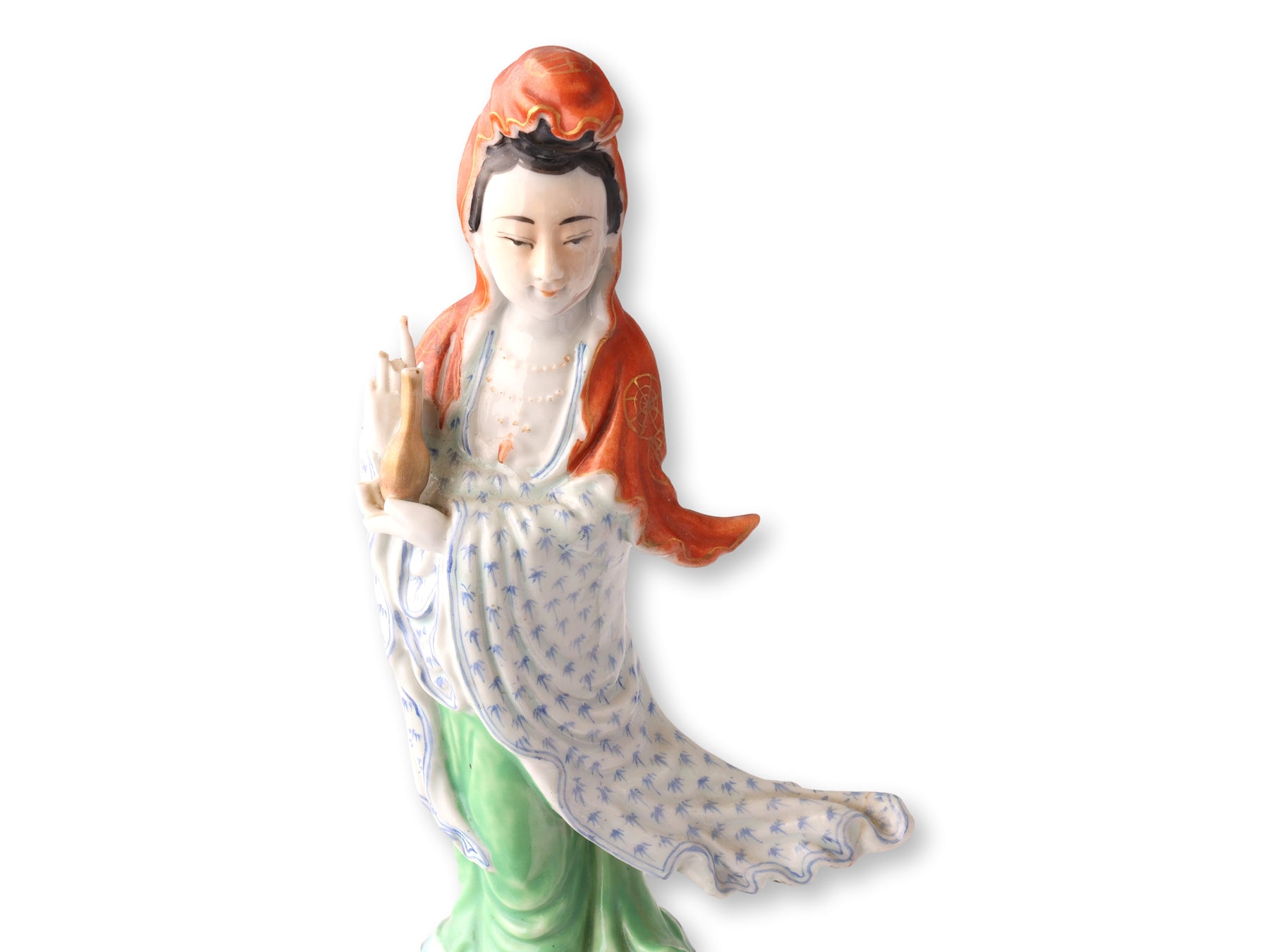 Elegant mid-century Chinese porcelain figure of Guanyin, the Goddess of Mercy, rendered in the famille rose palette. She stands on a lotus base above swirling waves, holding a sacred vase and dressed in flowing robes with iron red, celadon, and lavender enamel detail. Stamped MADE IN CHINA on the underside, indicating export production circa 1950s–60s. A graceful addition to any altar, vignette, or chinoiserie-inspired space.