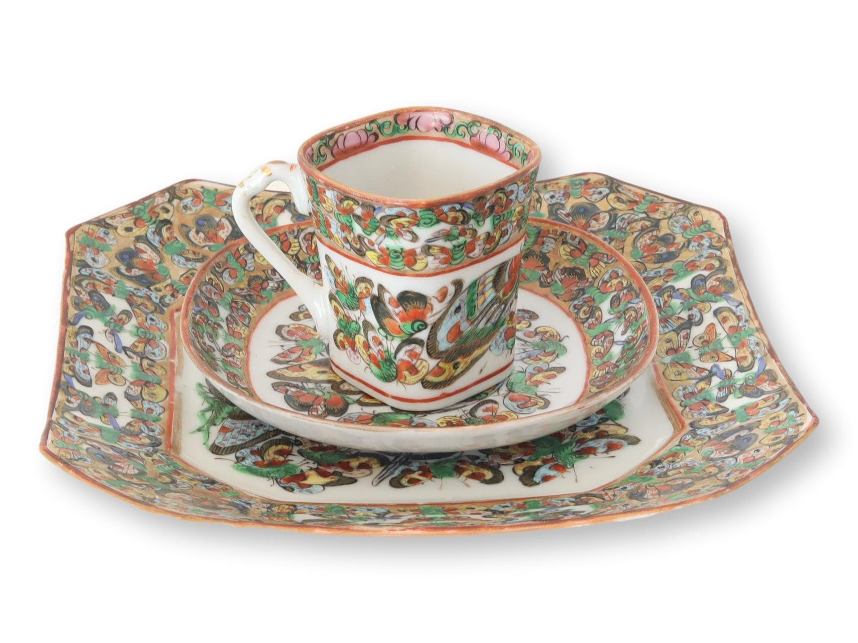 Experience the rich history of Chinese craftsmanship with our exquisite Antique Chinese Export Espresso and Cake Set in the Thousand Butterfly pattern. Dating back to the late 19th to early 20th century, each piece boasts an unusual square shape adorned with meticulously hand-painted designs. The vibrant polychrome palette of greens, blues, iron oxide, yellow, and black showcases the artisan's skill. The red glaze mark "Made in China" or "China" on the reverse, in adherence to the 1891 country of origin import law, adds authenticity to this timeless collection. Own a piece of cultural heritage and artistic finesse with this remarkable set.